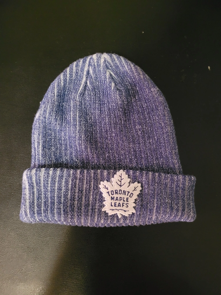 Blue and white Toronto Maple Leafs NHL beanie. Features team logo and NHL logo. Knit material. Great for cold weather.