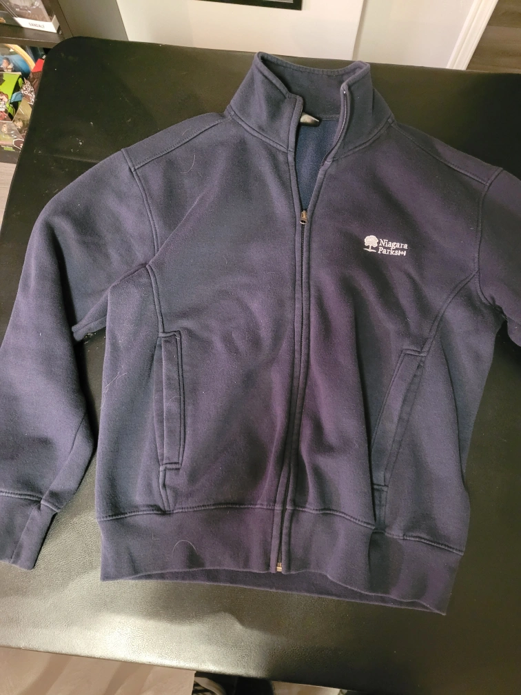 Navy blue zip-up fleece jacket. Features a high collar and two front pockets. Good condition. Embroidered logo.
