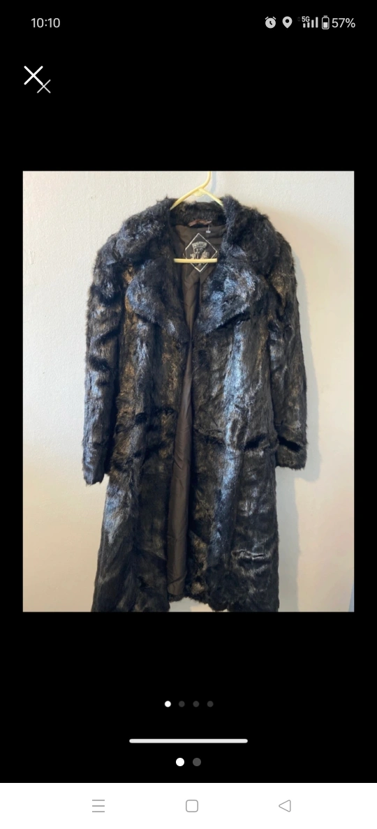 Long black faux fur coat. Open front. Long sleeves. Pockets. Soft material. Great for colder weather.