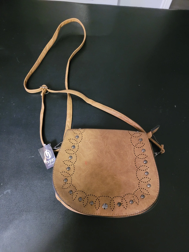 Cute brown crossbody bag. Features a unique design. Adjustable strap. Perfect for everyday use.