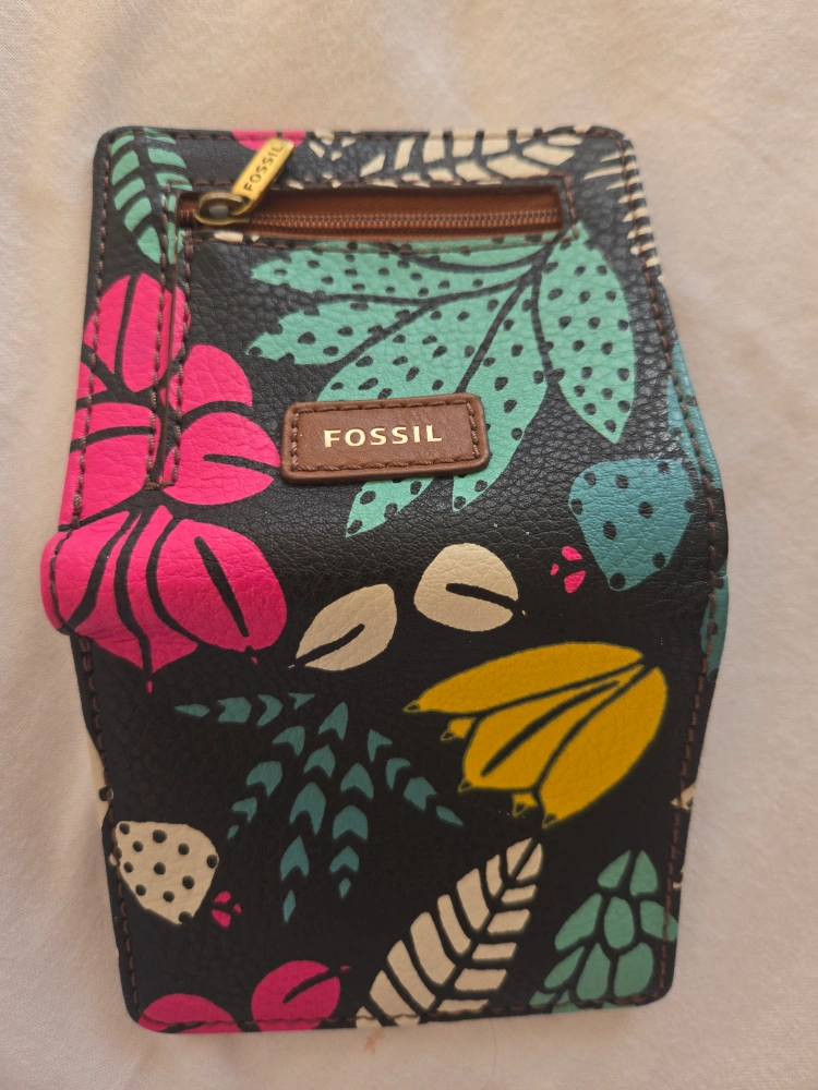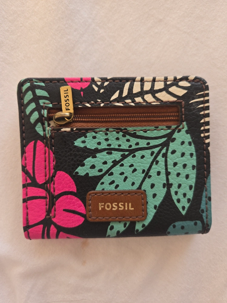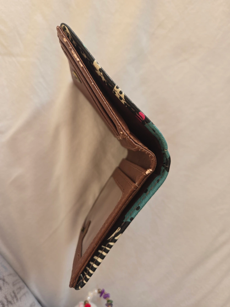 Compact bi-fold wallet. Features a vibrant floral print on a black background. Includes multiple card slots and a zippered coin pouch. Brown leather-like interior. some scratches inside still in good condition