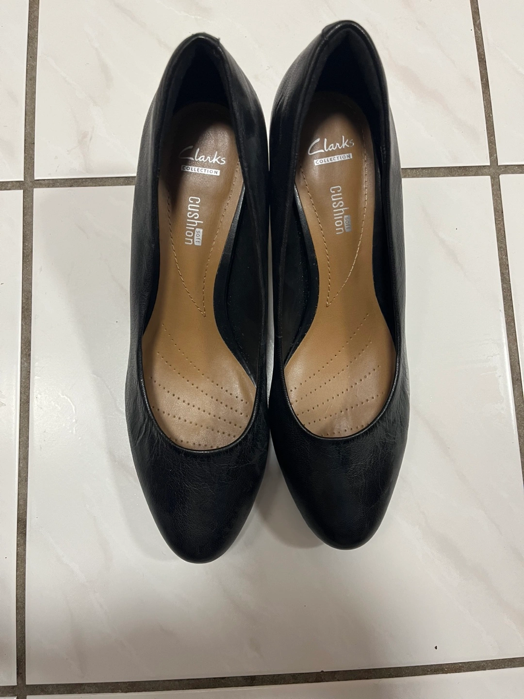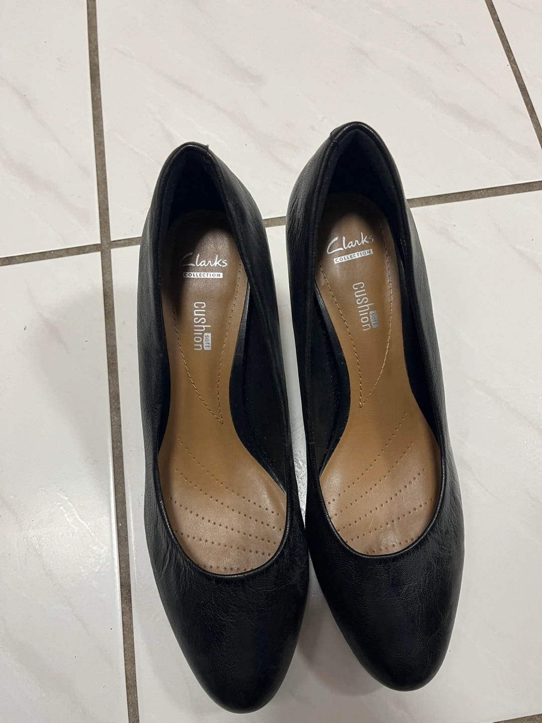Women's black leather heels. Low wedge heel. Clarks Collection Cushion Soft brand. Good for work or special occasions.