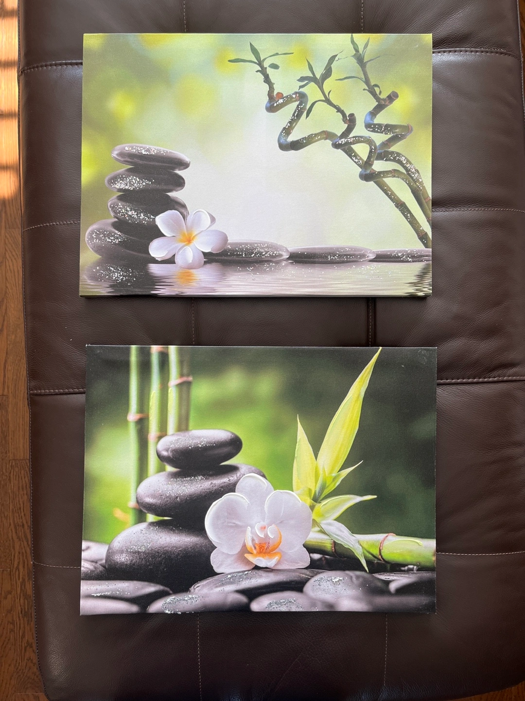 Two coordinating canvas prints featuring stacked stones, bamboo, and flowers. Ready to hang with attached hardware. Relaxing nature scene. Just bought but don’t match my decor
