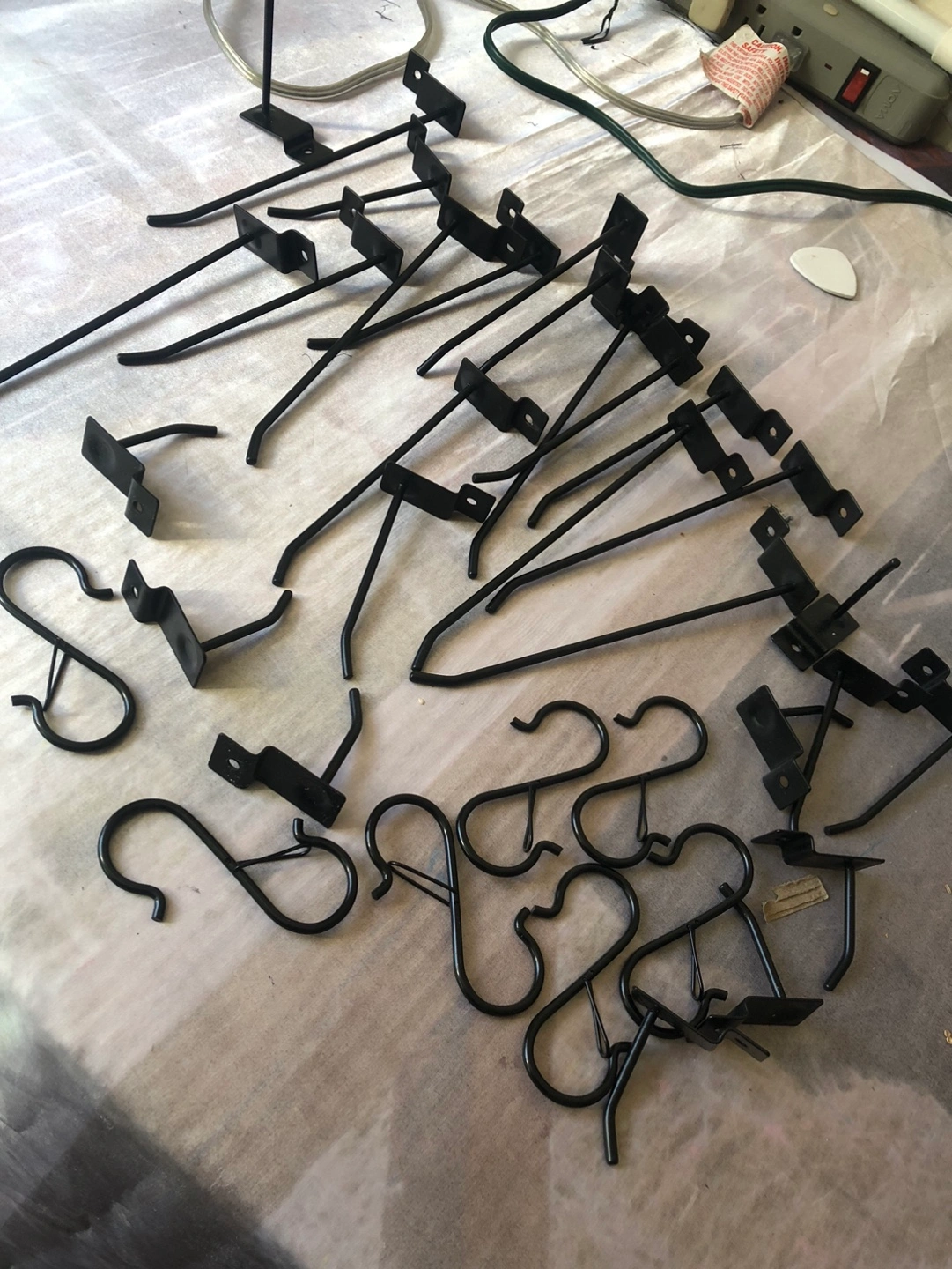Assortment of black metal hooks and holders. Various sizes and styles. Ideal for organizing or retail display. Some hooks have mounting plates.
