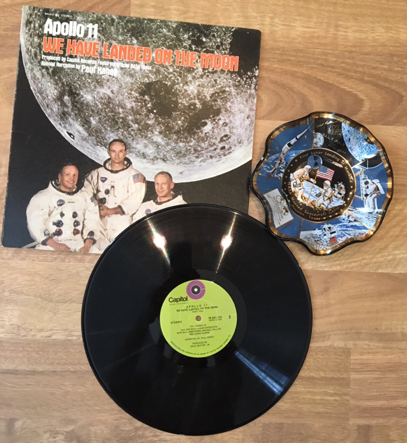 Apollo 11 commemorative items. Includes vinyl record, and decorative dish (never used). Souvenirs celebrating the moon landing in 1969. Thanks and please see my other ads!