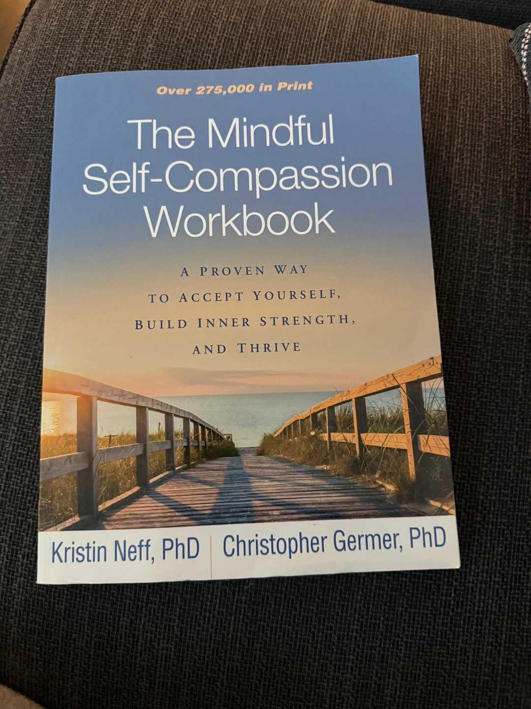 Self-compassion workbook. Proven way to accept yourself, build inner strength, and thrive. Authors Kristin Neff, PhD and Christopher Germer, PhD. Over 275,000 in print. This is a well amazing book. I just love the way it’s so easy to read. There’s a lot of helpful information in the book! Hasn’t been written in.