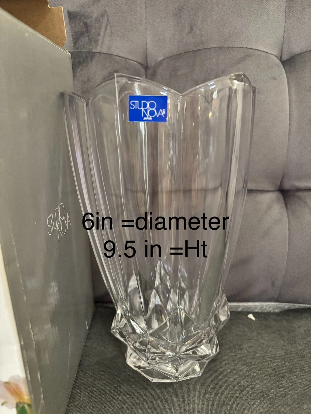 Elegant crystal glass vase. Faceted design. Measures 6 inches in diameter and 9.5 inches in height. In original box.