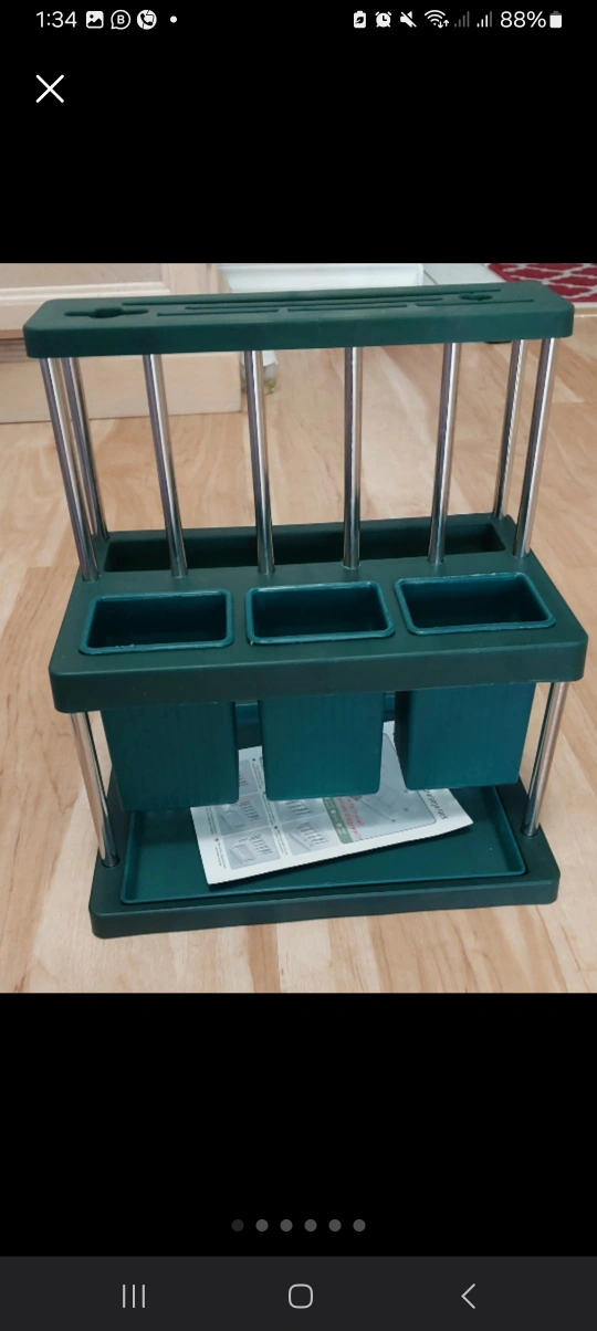 Two-tiered cutlery organiser. Green plastic construction with chrome accents. Includes knife slots, utensil holders and a tray. Perfect for organising your kitchen drawers and countertops. can be used for cosmetic, brushes, bathroom or stationery etc aswell Smoke free and pet free home Kindly note all sales are final and no return or refund Please check my other listings aswell😊