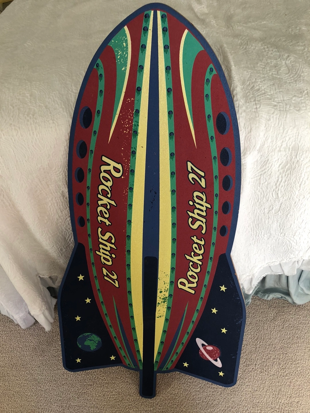 Unique rocket-shaped wall hanging. Features a retro design. Made of wood. Ready to hang with pre-installed hardware.