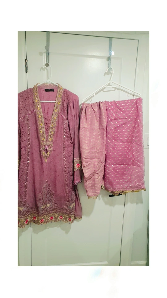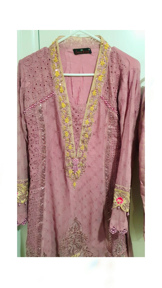 Beautiful dusty rose three-piece suit. Intricate embroidery and embellishments. Long sleeves, detailed neckline. Comes with matching trousers and dupatta. Perfect for special occasions.