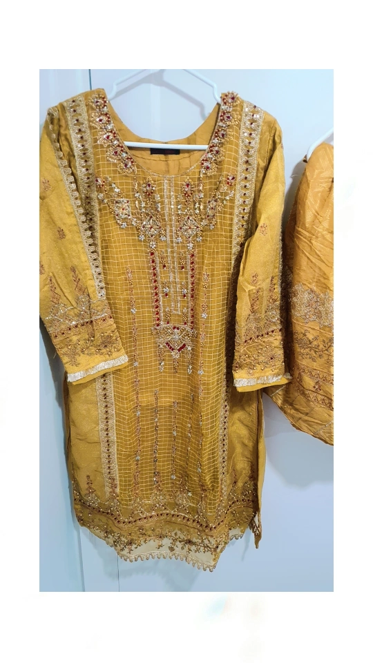 Beautiful mustard yellow three-piece shalwar kameez. Intricate gold embroidery. Includes a kameez, shalwar, and dupatta. Ready to wear.