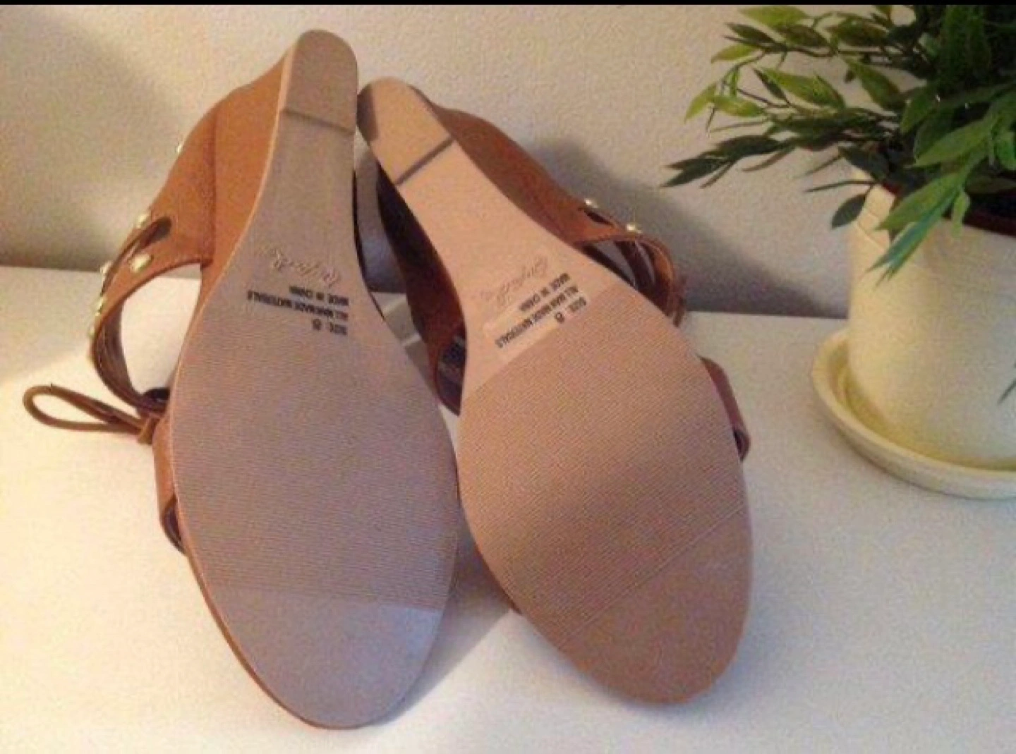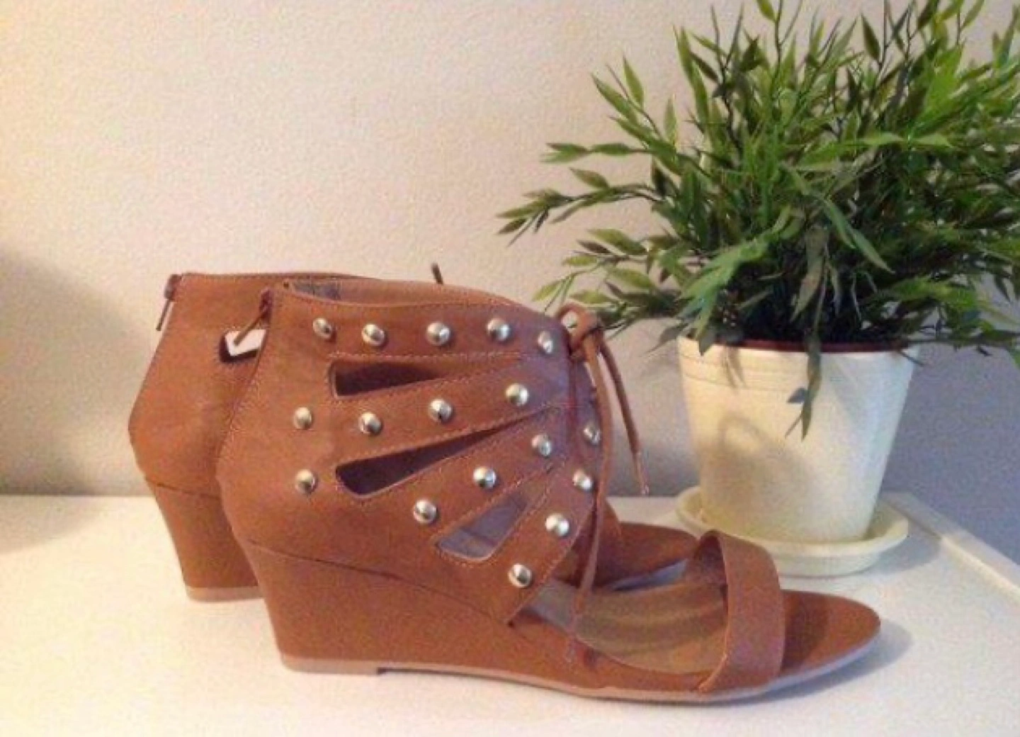 New unworn wedge sandals Brown vegan leather with gold stud detailing. Back zipper and front lace up option. Ordered online for $35+ but the fit is a little too narrow for me. SFPF home. Pick up Kingston road and Dundas street east (Beaches) area.