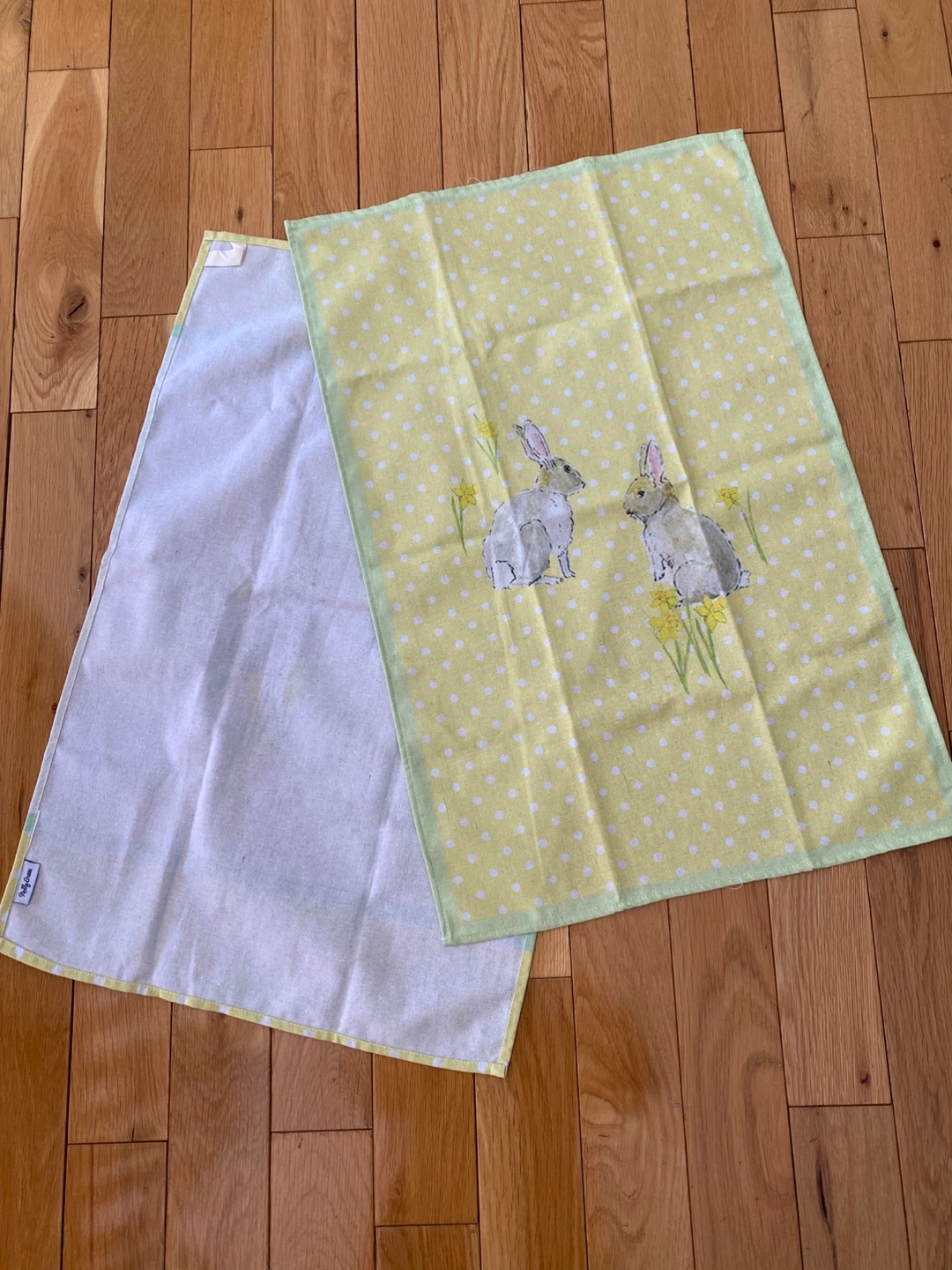 •NEW!!! Never used!!! •Excellent condition, clean, no breakage •Make: Molly Green (see pic) •Purchased: Homesense •2 New Tea Towels •Pastel yellow with white polka dots background •One side features two bunnies amongst daffodils the other side plain •Size: Length: 27” x width 17 1/2” •100% Recycled Cotton (see pic) •Perfect for Easter or Spring •smoke-free, pet-free environment *****LOCATION: Jane & Lawrence ********