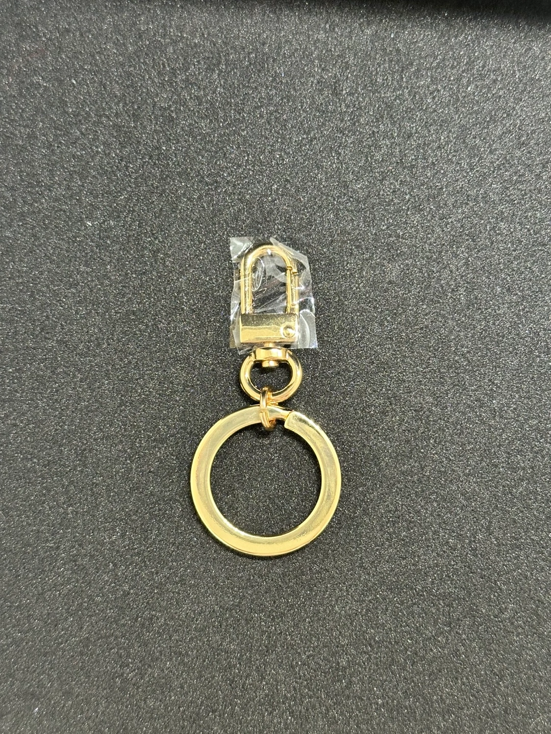 Gold-toned metal keychain. Features a lobster clasp and a circular ring. Perfect for attaching keys. New, unused.