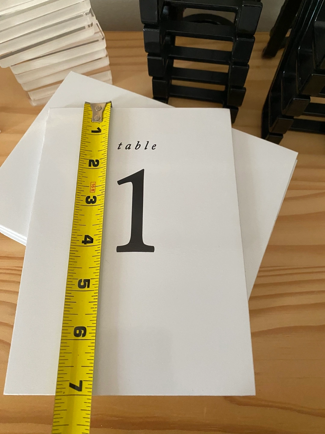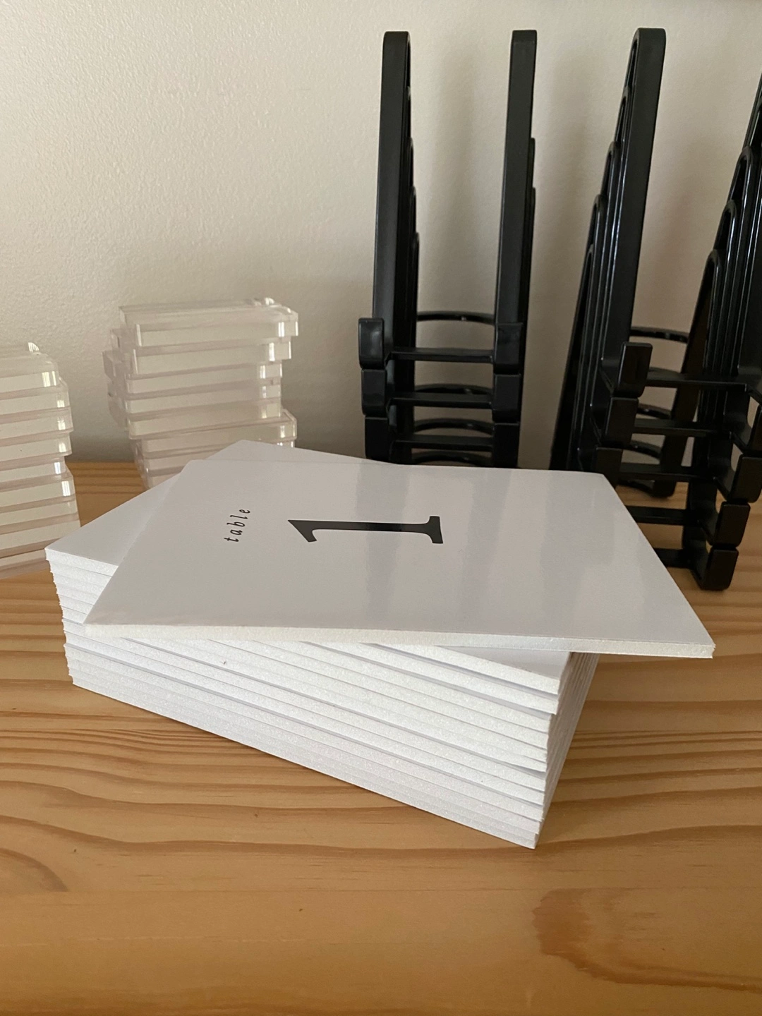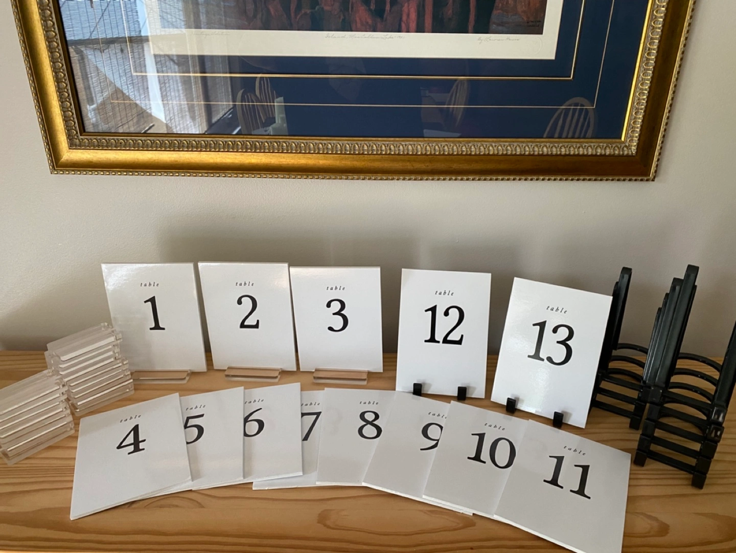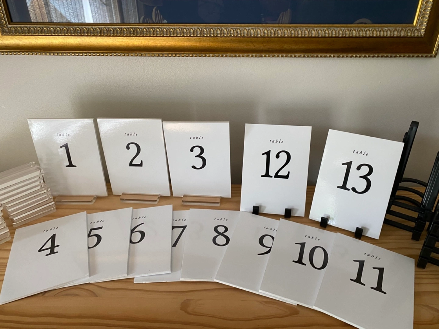 •NEW!!! •Excellent condition, clean, no breakage •13 white table number cards, numbers 1-13 •Minimalist design, white with black numbers •Includes set of black plastic stands (see pic) •Includes set of Clear Plastic card stands (see pic) •Two types of stands included •See measurements •smoke-free, pet-free environment *****LOCATION: Jane & Lawrence *******