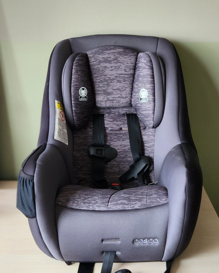 Convertible car seat, grey and black pattern. Suitable for various weight and height ranges. Side impact protection. Well-maintained.