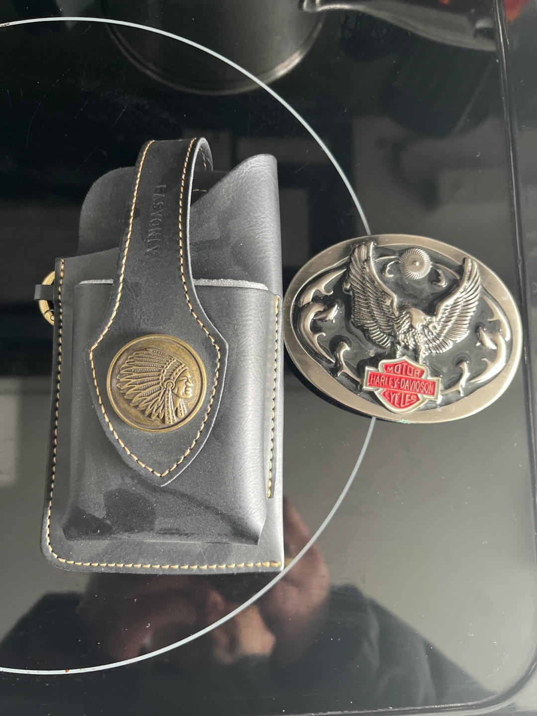 Vintage Harley Davidson belt buckle features an eagle design. Matching black leather phone case included. Great gift for the biker enthusiast. You can pick up by Carlton and Jarvis area