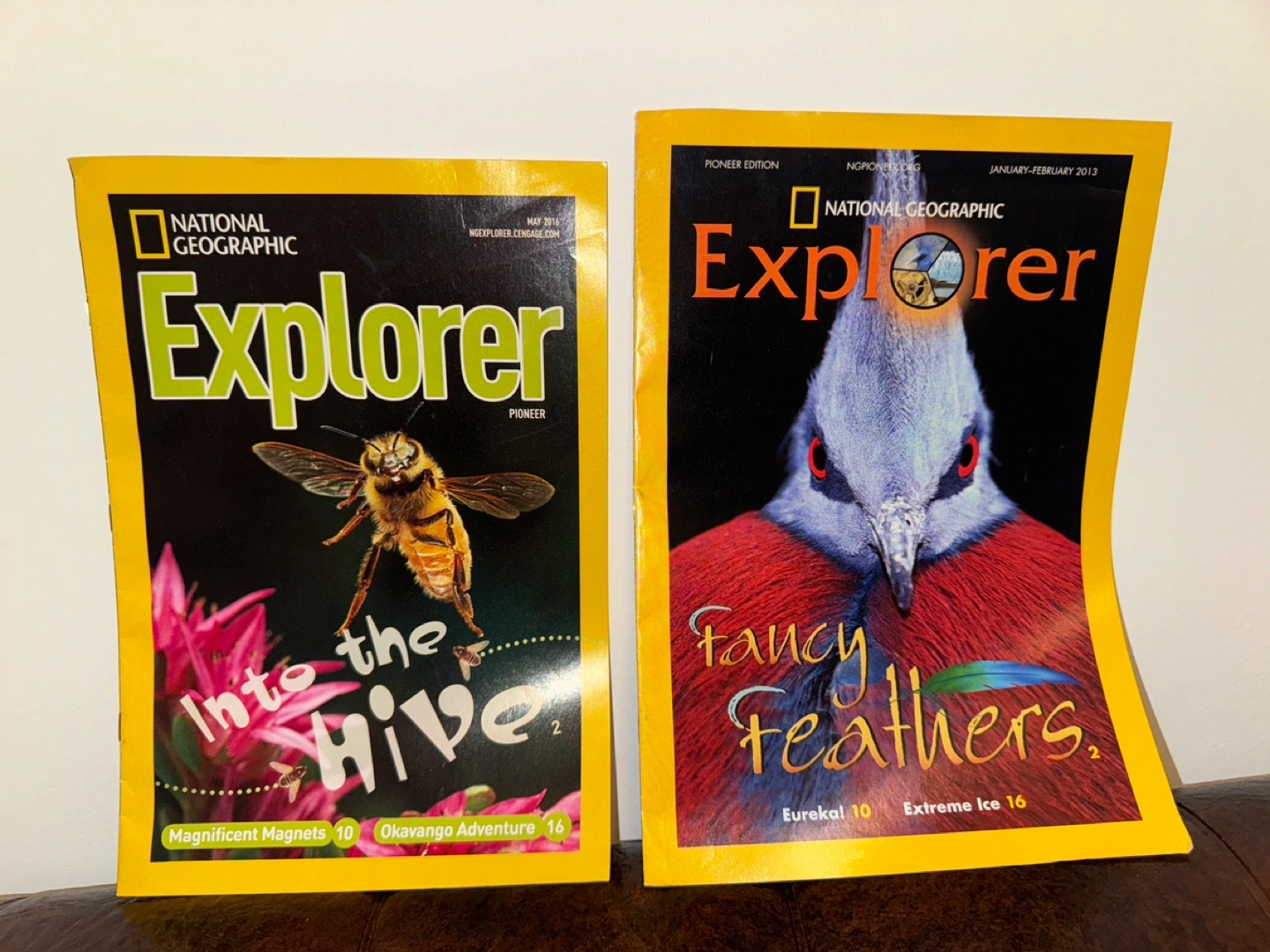 Four National Geographic Explorer magazines. Issues include: January/February 2012, September 2012, May 2012, and January/February 2013. Features penguins, snakes, bees and birds.
