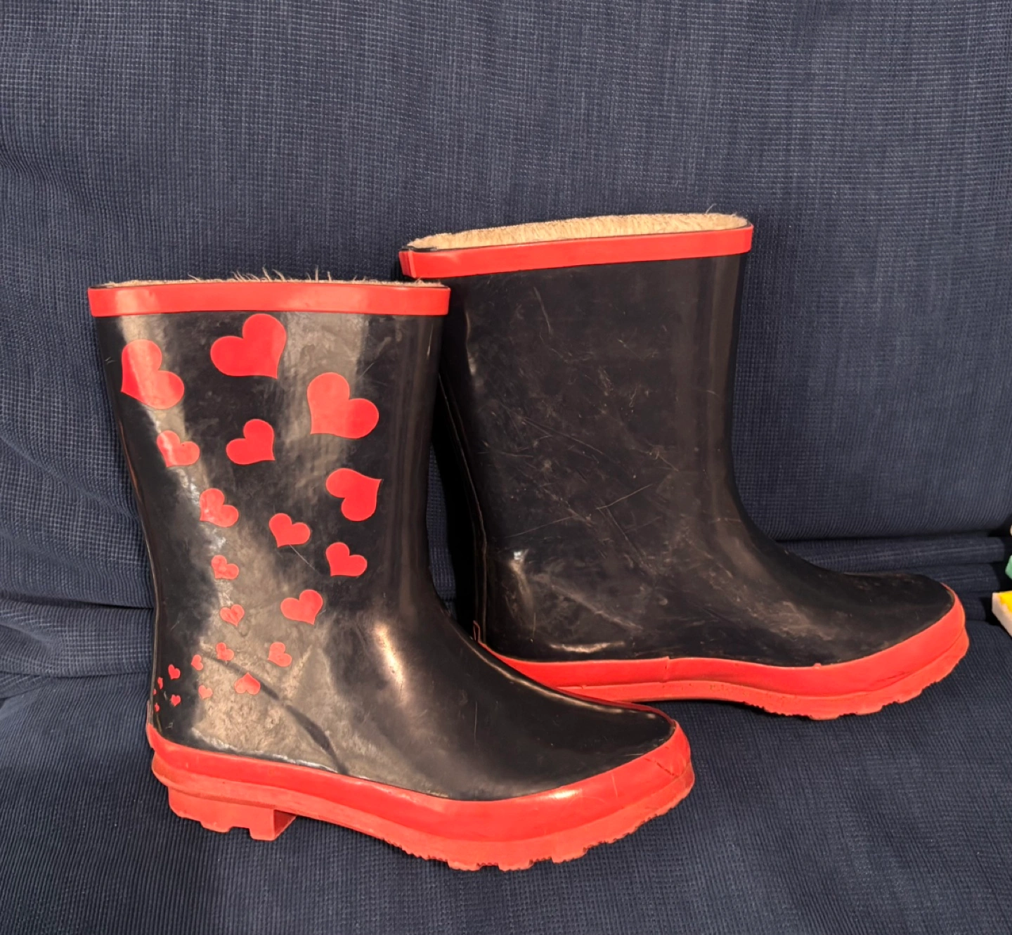 Pair of used kids' rain boots. Dark navy blue with red hearts. Red trim and fully lined. Size 3 Available in Barrhaven from smoke free and pet free home