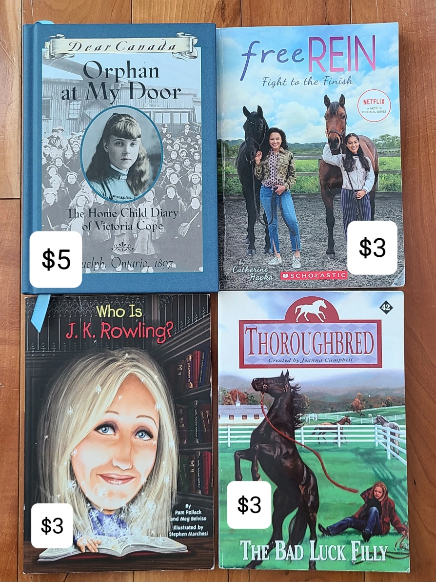 4 Children's Books for age 8-12y: Orphan at My Door -$5 Free Rein -$3 Who is J.K. Rowling? -$3 Thoroughbred -$3