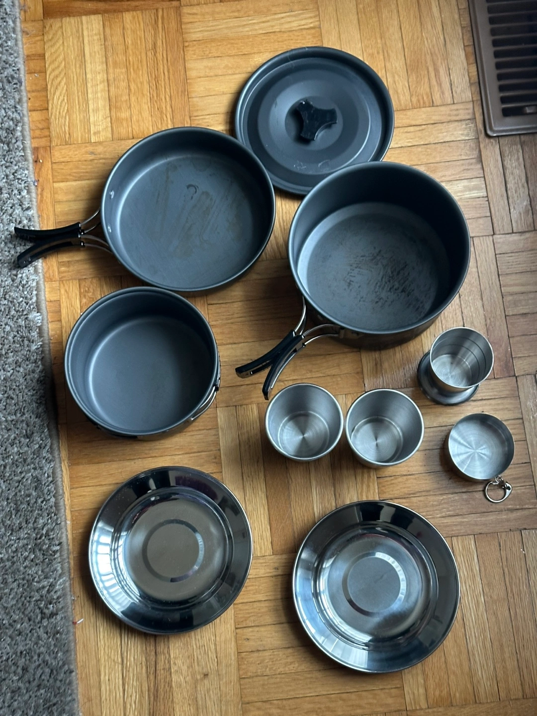 Complete camping cookware set. Includes two pots, two frying pans, lids, two plates, two cups, and a small container. Great for outdoor adventures.