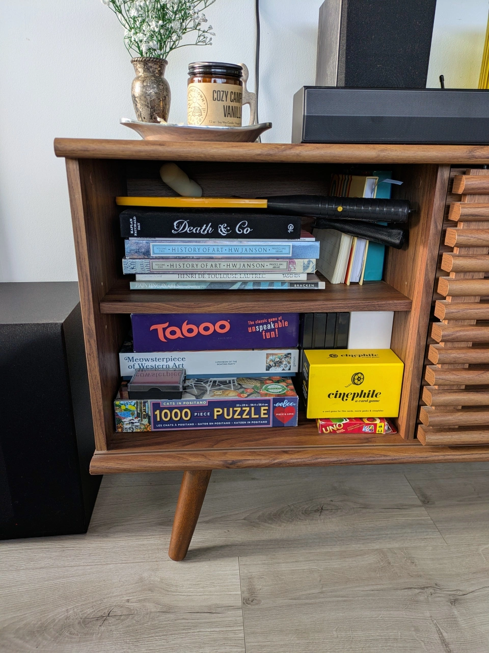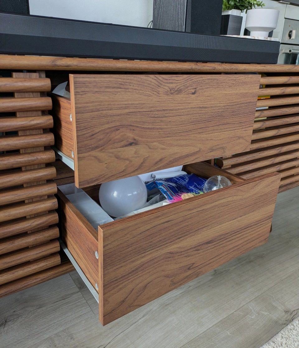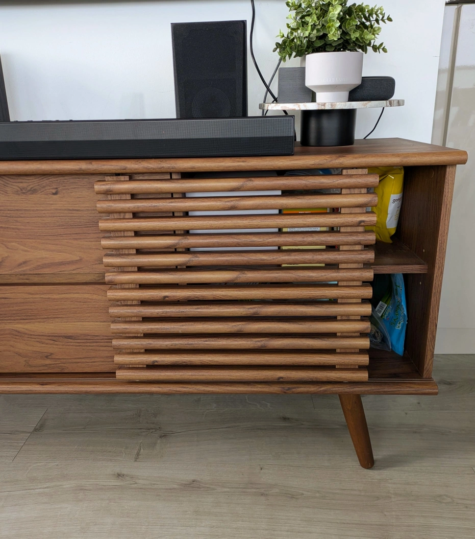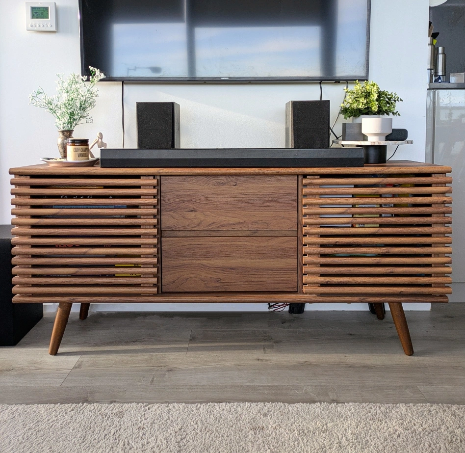 Beautiful MCM style TV stand in immaculate condition, barely one year old. Has lots of storage options, with two drawers and two sliding doors with open shelving. depth: 15" length: 55" height: 24.5" Only selling because I'm moving, otherwise I would keep this! Originally purchased for $470. No low ballers please. Moving sale - check out my other listings ✨