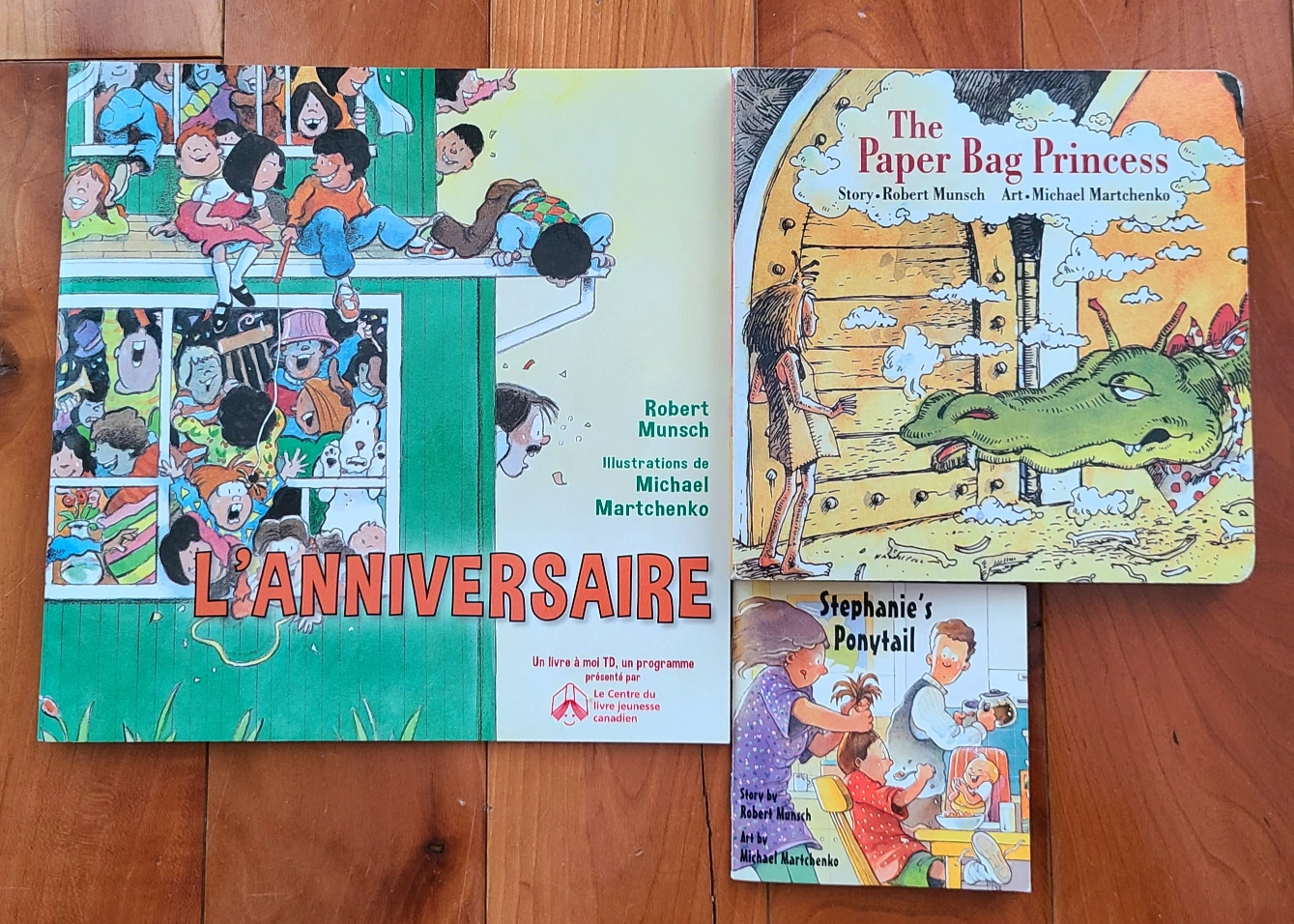 Collection of three books by Robert Munsch. Includes L'Anniversaire, The Paper Bag Princess, and Stephanie's Ponytail. Illustrated by Michael Martchenko.