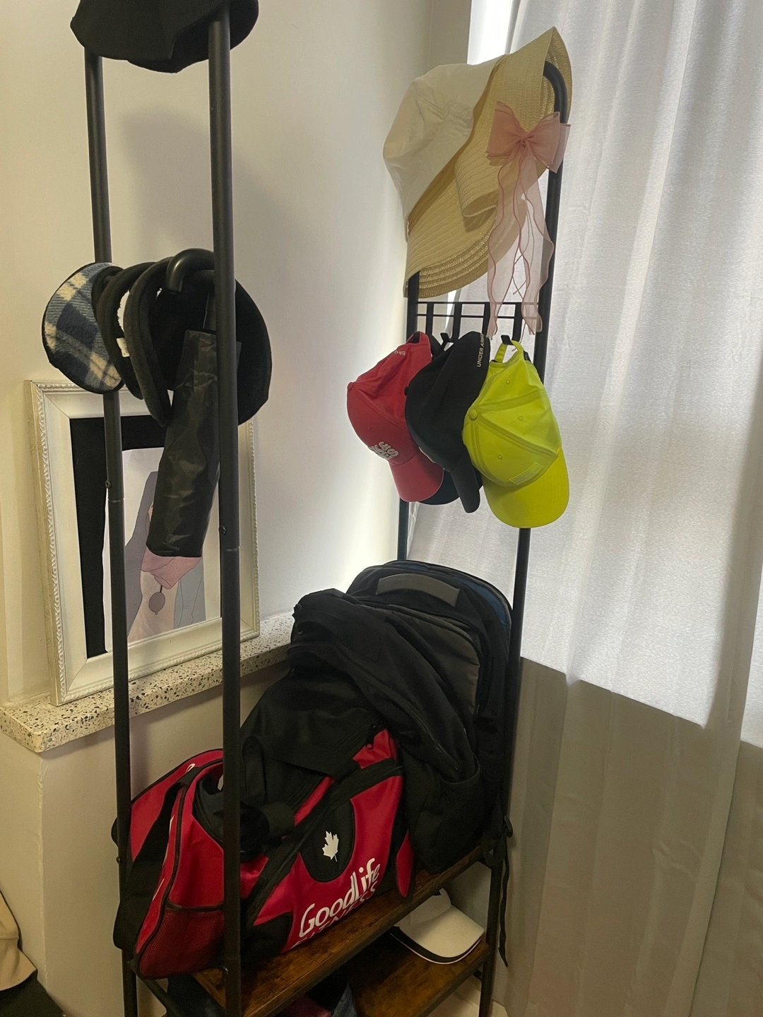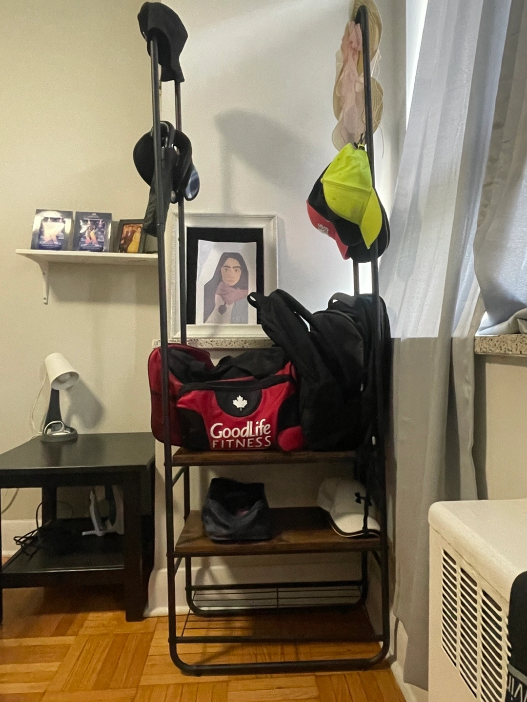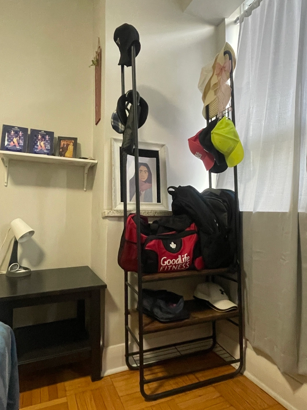 Three-tiered storage unit. Metal frame, wooden shelves. Top features hooks for hanging hats and other items. Great for entryways or bedrooms.