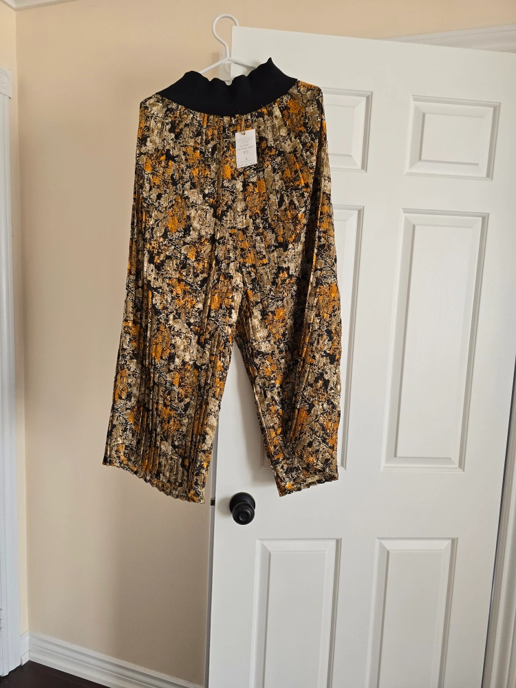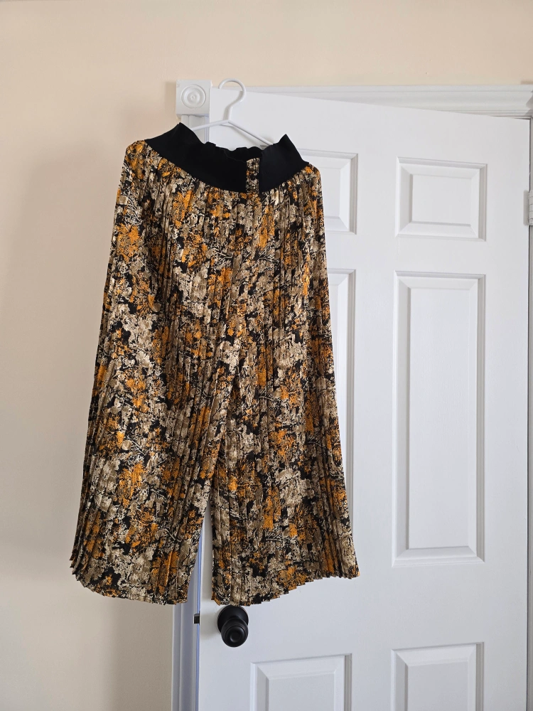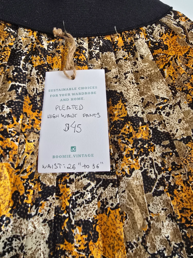 Vintage pleated high waist pants. 26 to 36 inch waist. Gold, black and beige abstract print. Elastic waistband.