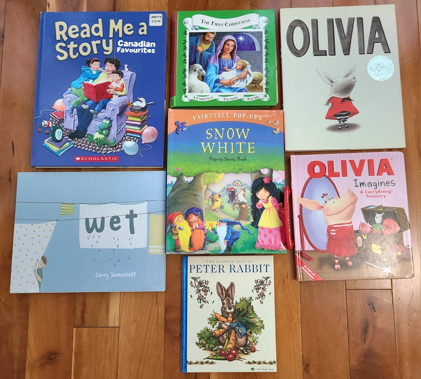 Children's books. Includes titles like *Read Me a Story*, *Olivia*, *Snow White*, and *Peter Rabbit*. Various publishers and formats. Age 3-6y $5 each