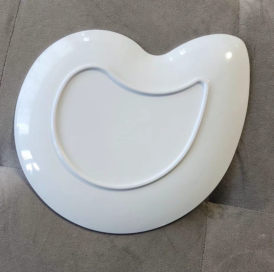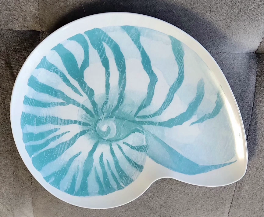 Unique serving platter. Features a nautilus shell design. Aqua coloured design on white melamine. Measures approx. 9.5" wide by 8" long and 0.75" high. Dishwasher safe. Like new condition. Great for indoor or outdoor entertaining.