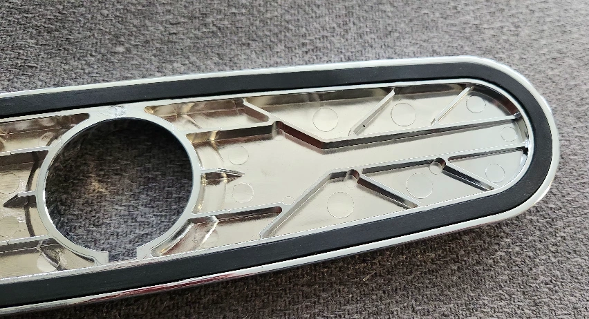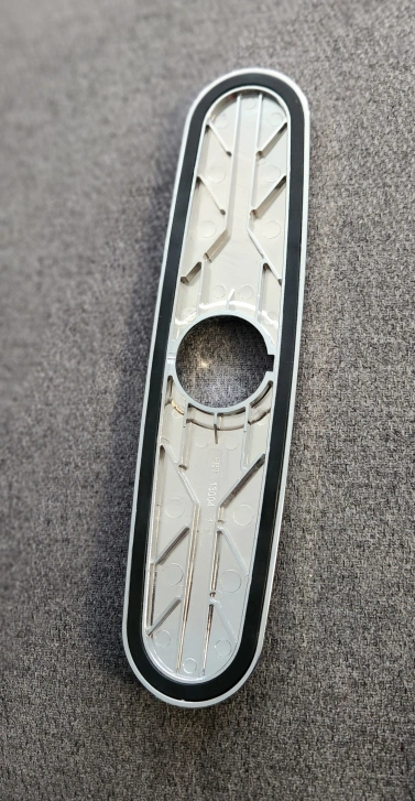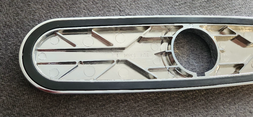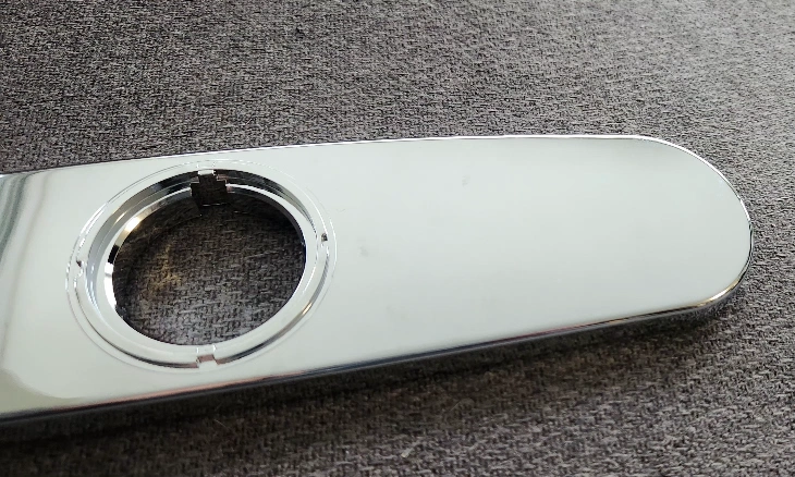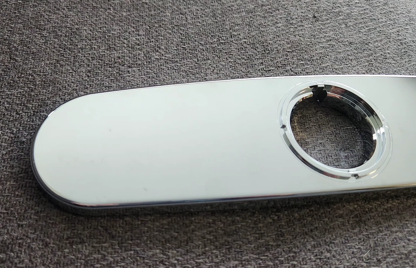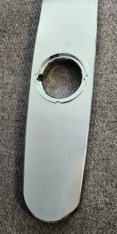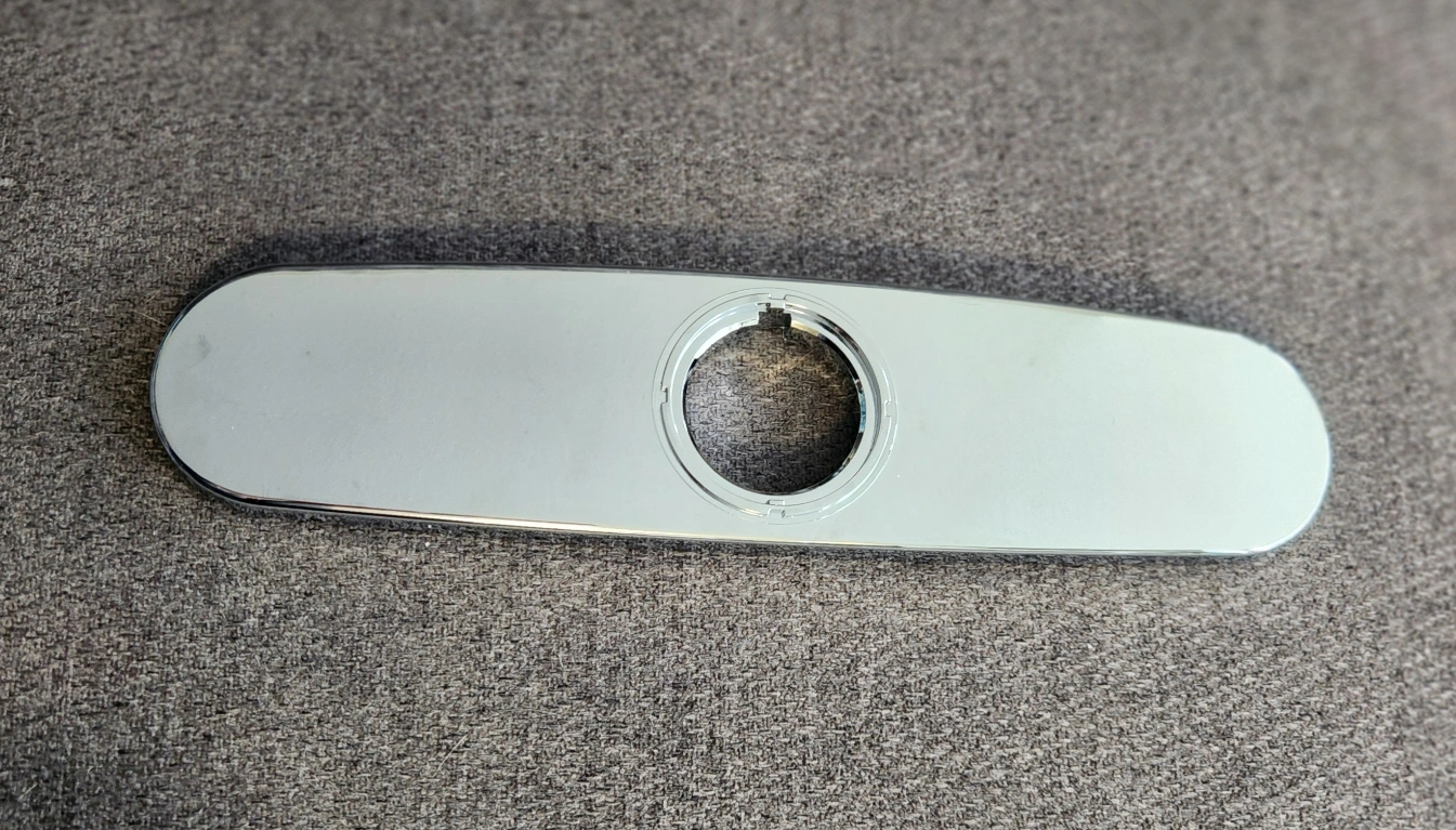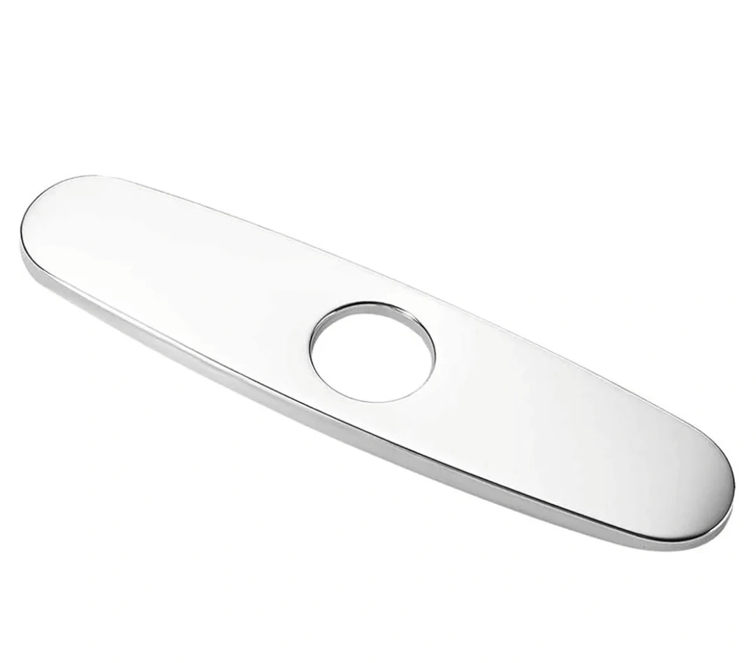 Brand new chrome faucet deck plate with rubberized bottom. Oval shape. Suitable for bathroom or kitchen sink. Compatible with most single hole sinks or allows single hole faucet to be installed over 3 hole sinks. Measurements: Length: 10.25"' Width: 2.5'' Thickness: 0.3" Hole diameter: 1.5''