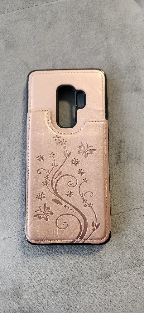 Rose gold leather phone case with floral design. Features a wallet with 2 card slots that securely hold your cards and some cash without taking your wallet. The kickstand can be converted into multi-angles for comfortable viewing. Compatible with Samsung Galaxy S9 Plus phone.