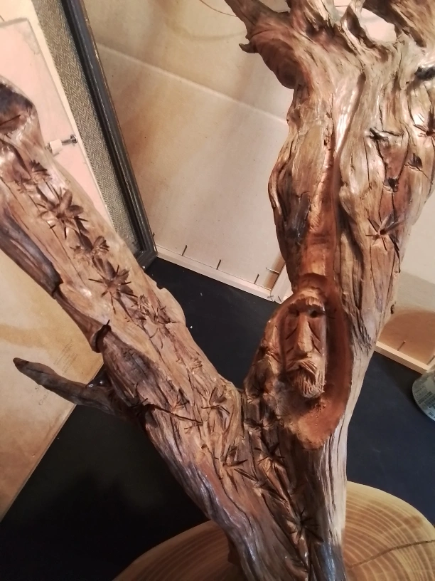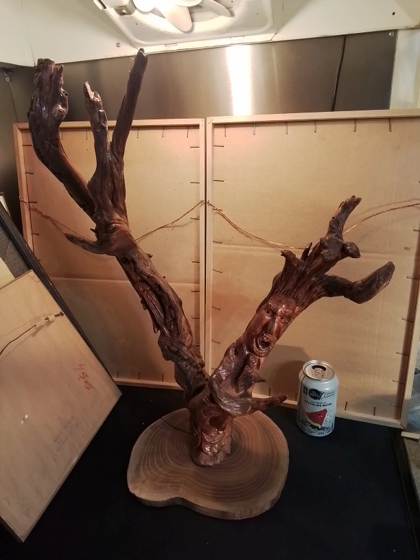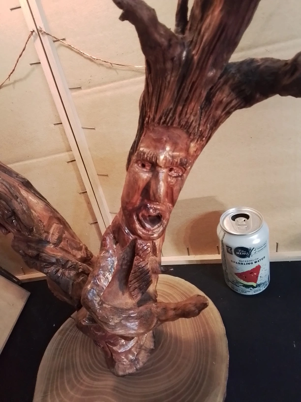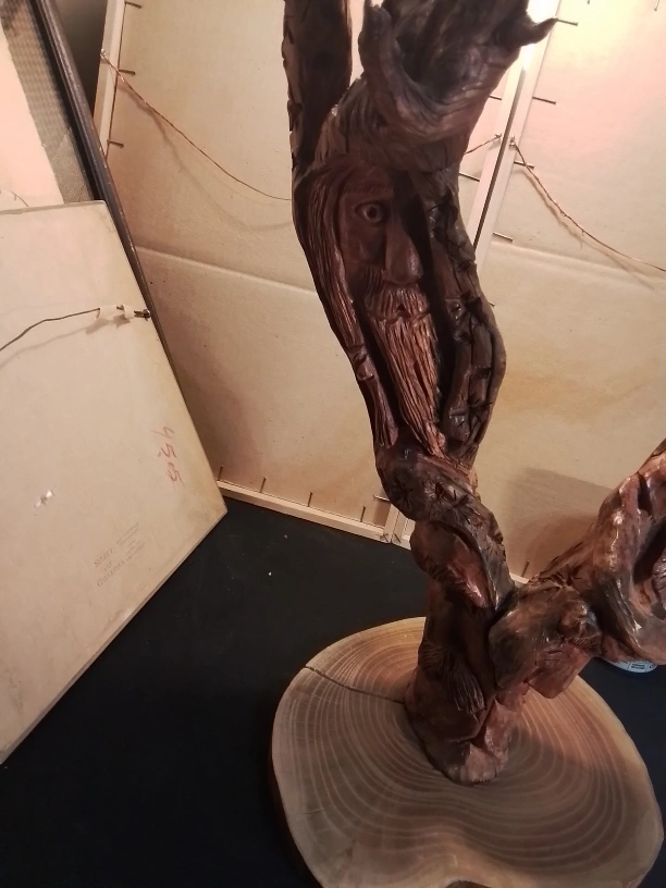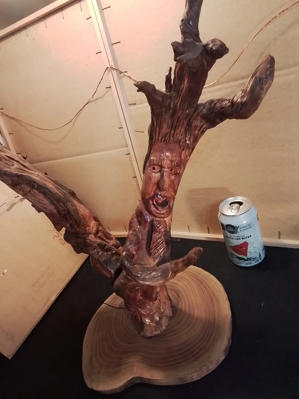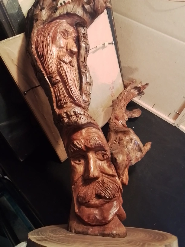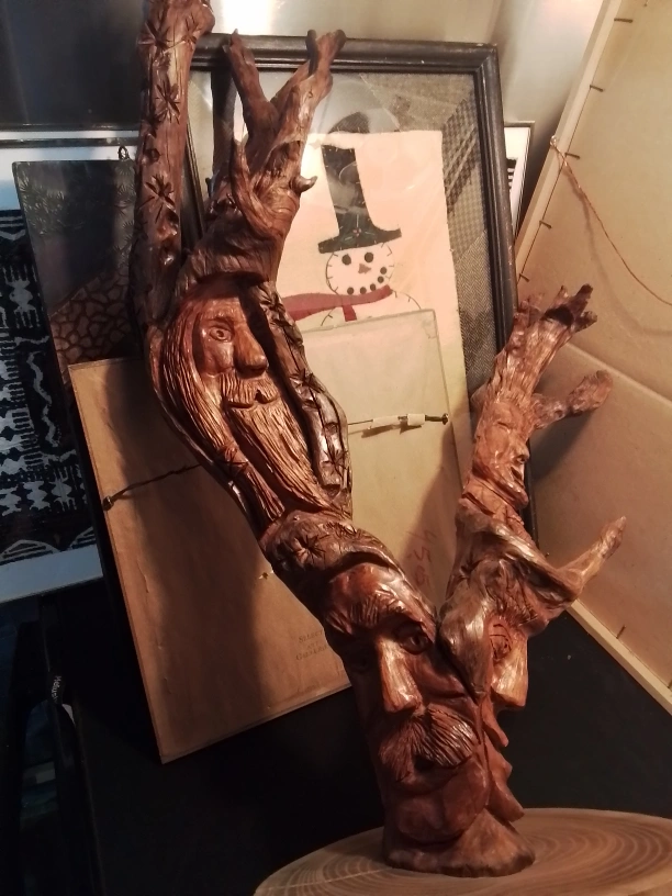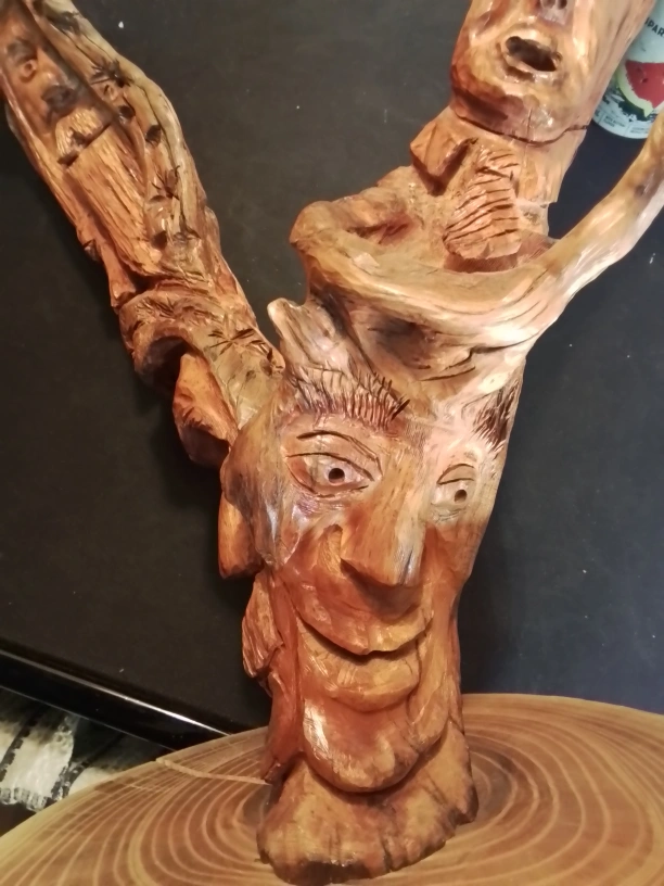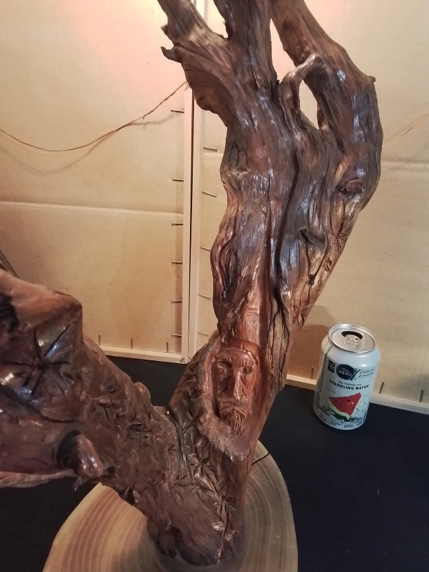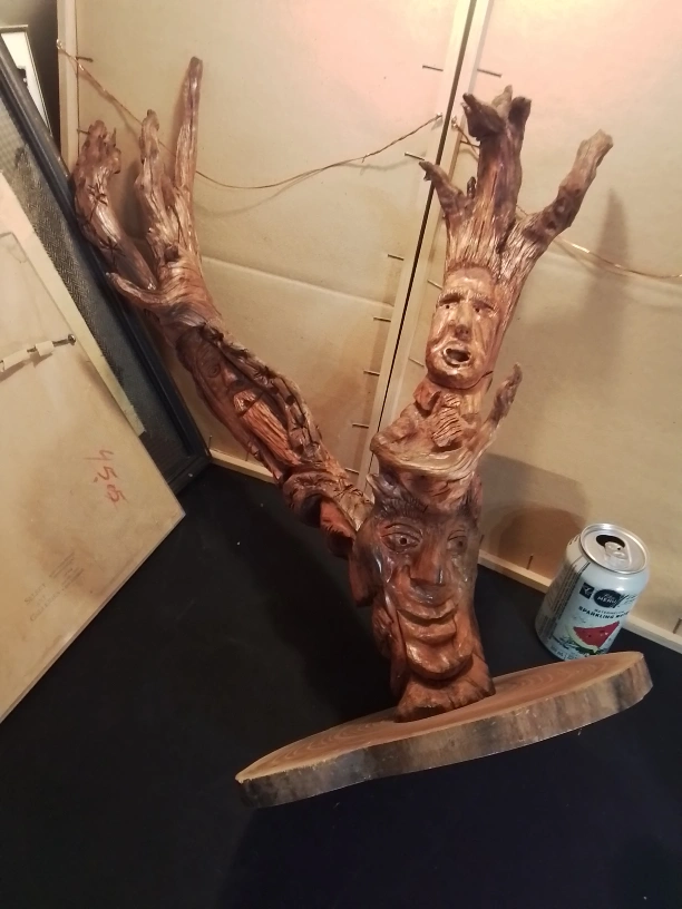 Hand Carved Root Wooden Sculpture Unique Carved Wood Tree Sculpture Intricate wood carving. Features multiple faces carved into a tree-like form. Mounted on a round wooden base. A one-of-a-kind piece. 16X10X23" H. Please See photos for more details. Condition: Minor wear. Pickup at Young Street and Steels Ave