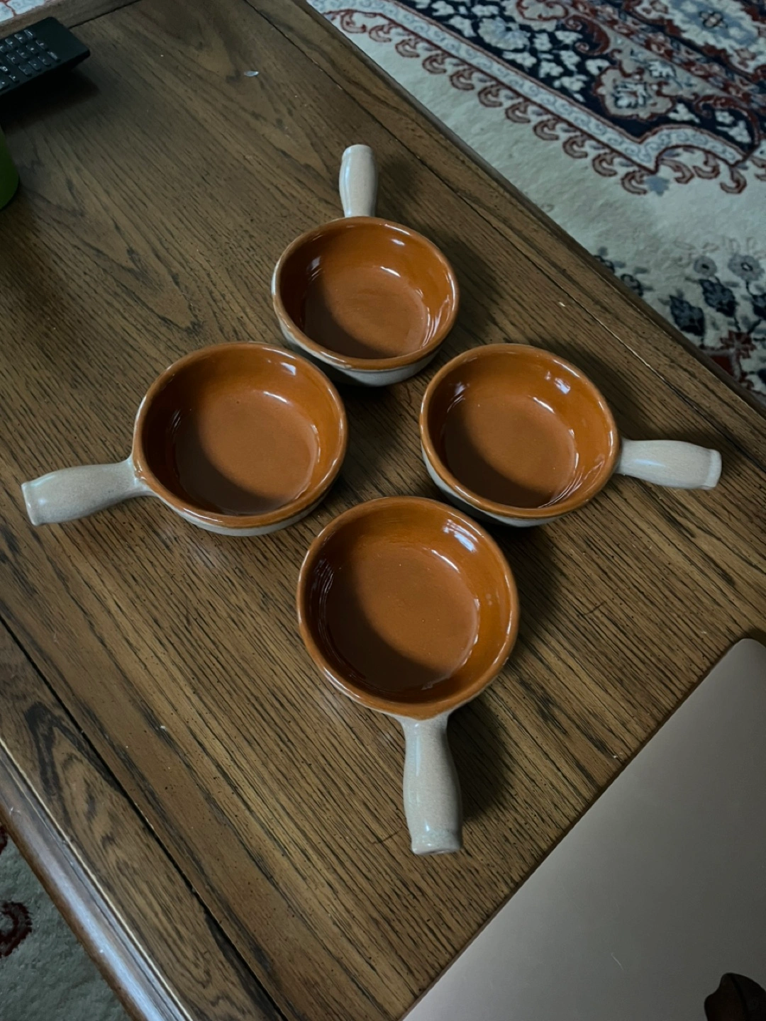 Four vintage French onion soup bowls. Stoneware with a dip glaze. Bought in Europe in the 1980’s. Pick up close to Hastings and Boundary.