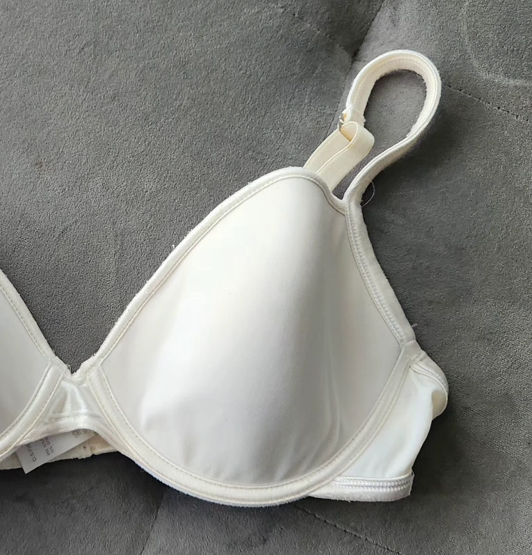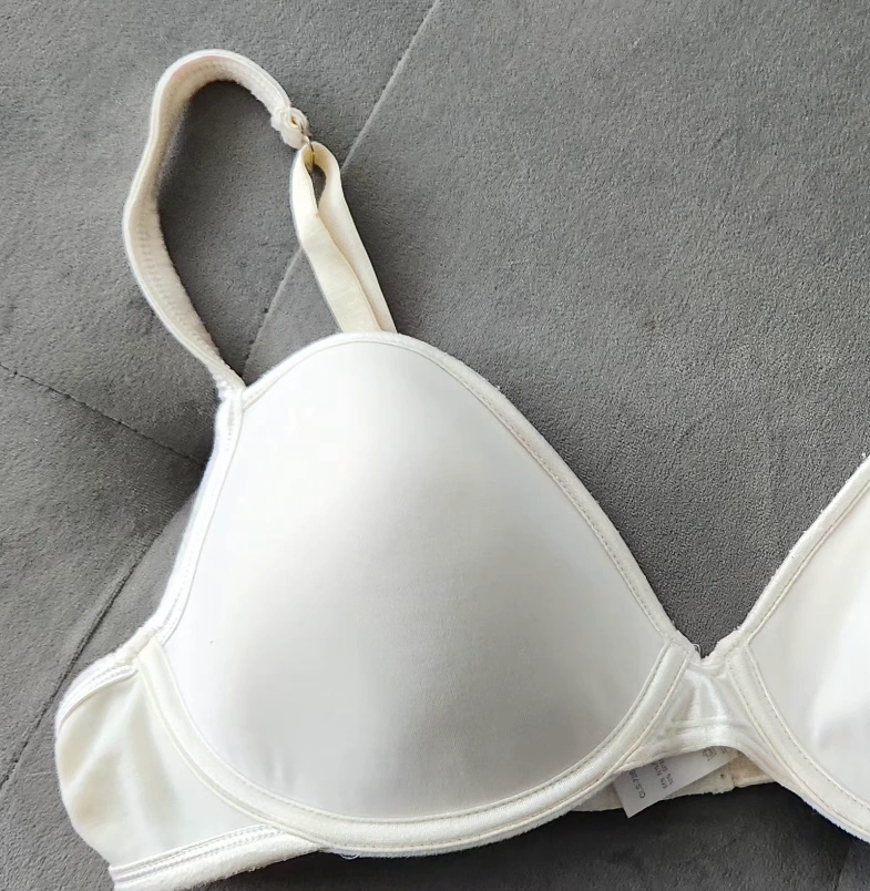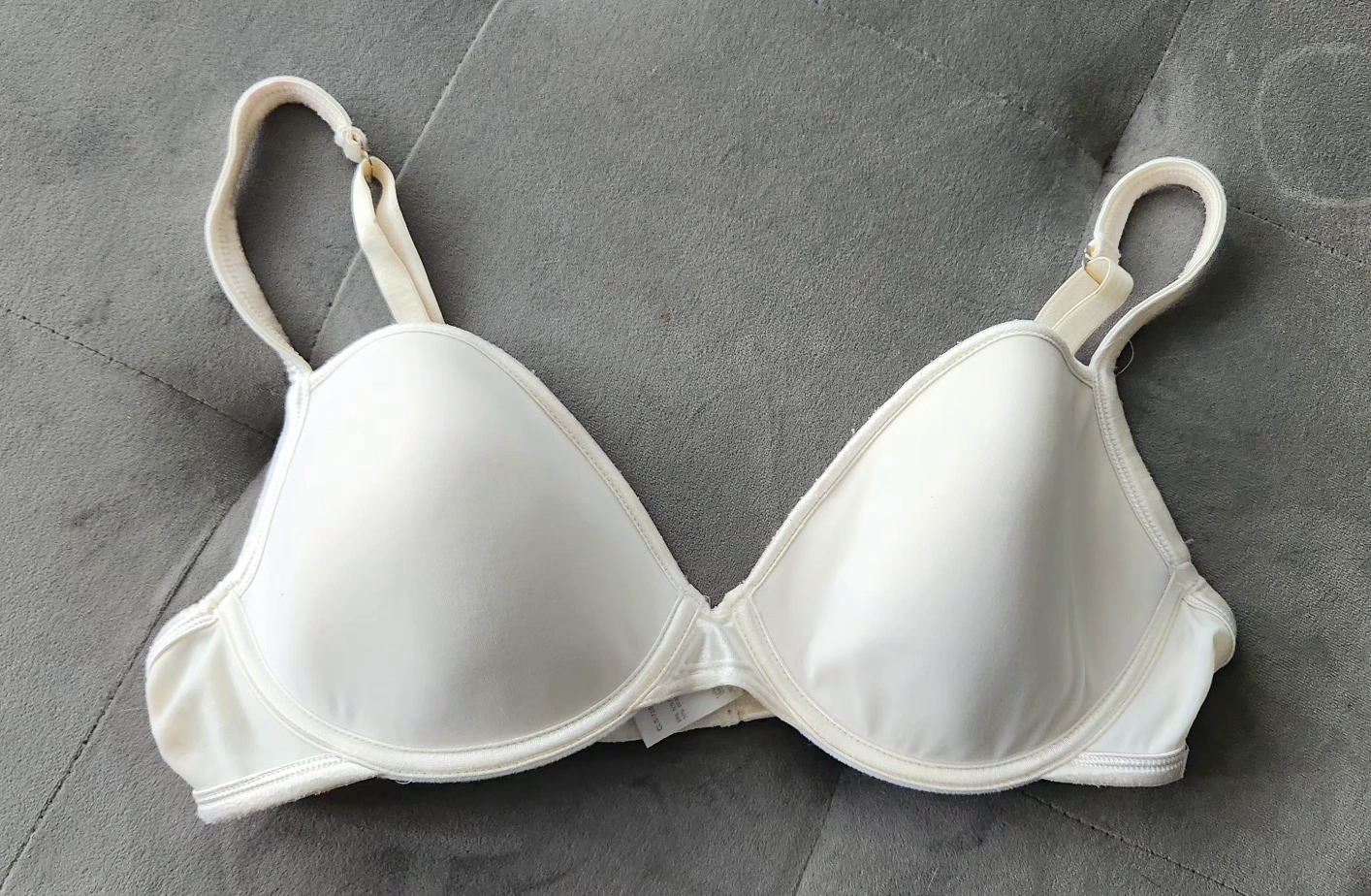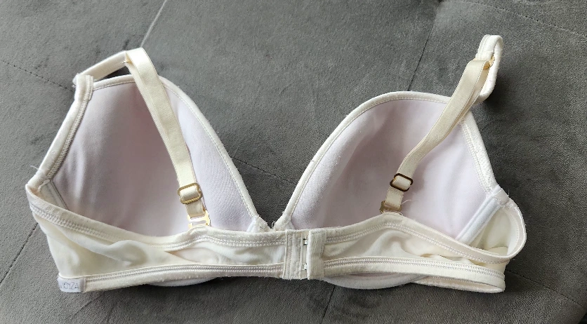 La Senza Lingerie white bra. Size 36C. Adjustable straps with gold accents. Hook-and-eye closure. Smooth fabric. Functional condition but has some very slight colour difference on the back (see photos).