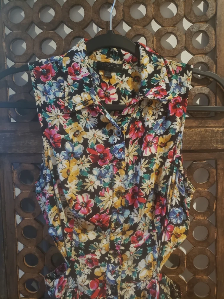 Adorable floral print sleeveless romper. Features a collared neckline, button placket and side cutouts. It's a comfortable lightweight fabric. Not to mention, so cute!