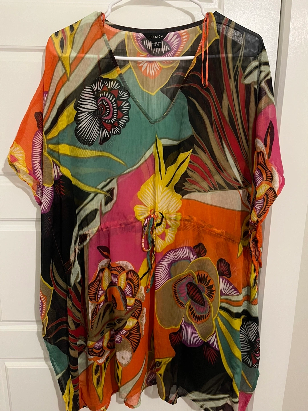 Lightweight sheer coverup. Vibrant floral print. Size L-XL. V-neck, short sleeves, drawstring waist.