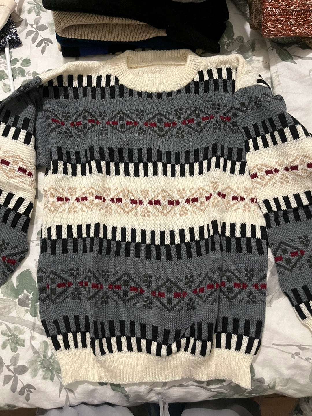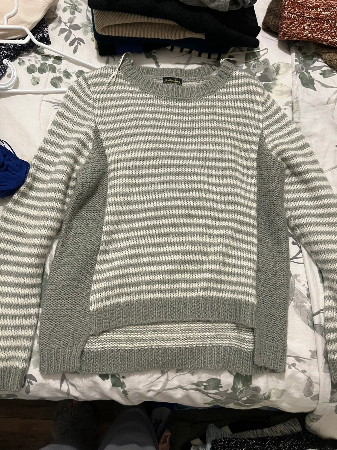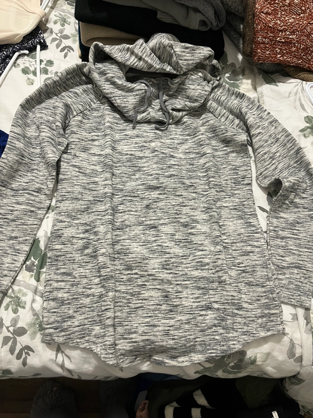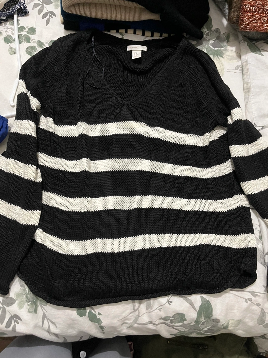 Five women's sweaters. Grey and black marl cardigan, cowl neck sweatshirt, light blue cowl neck sweatshirt, patterned fair isle sweater, and black and white striped V-neck sweater. Bundle for only $40