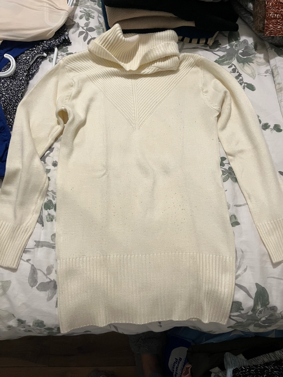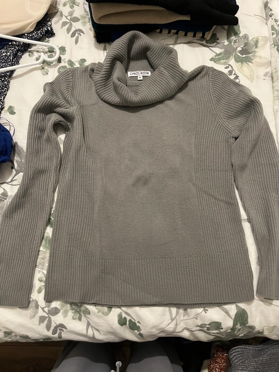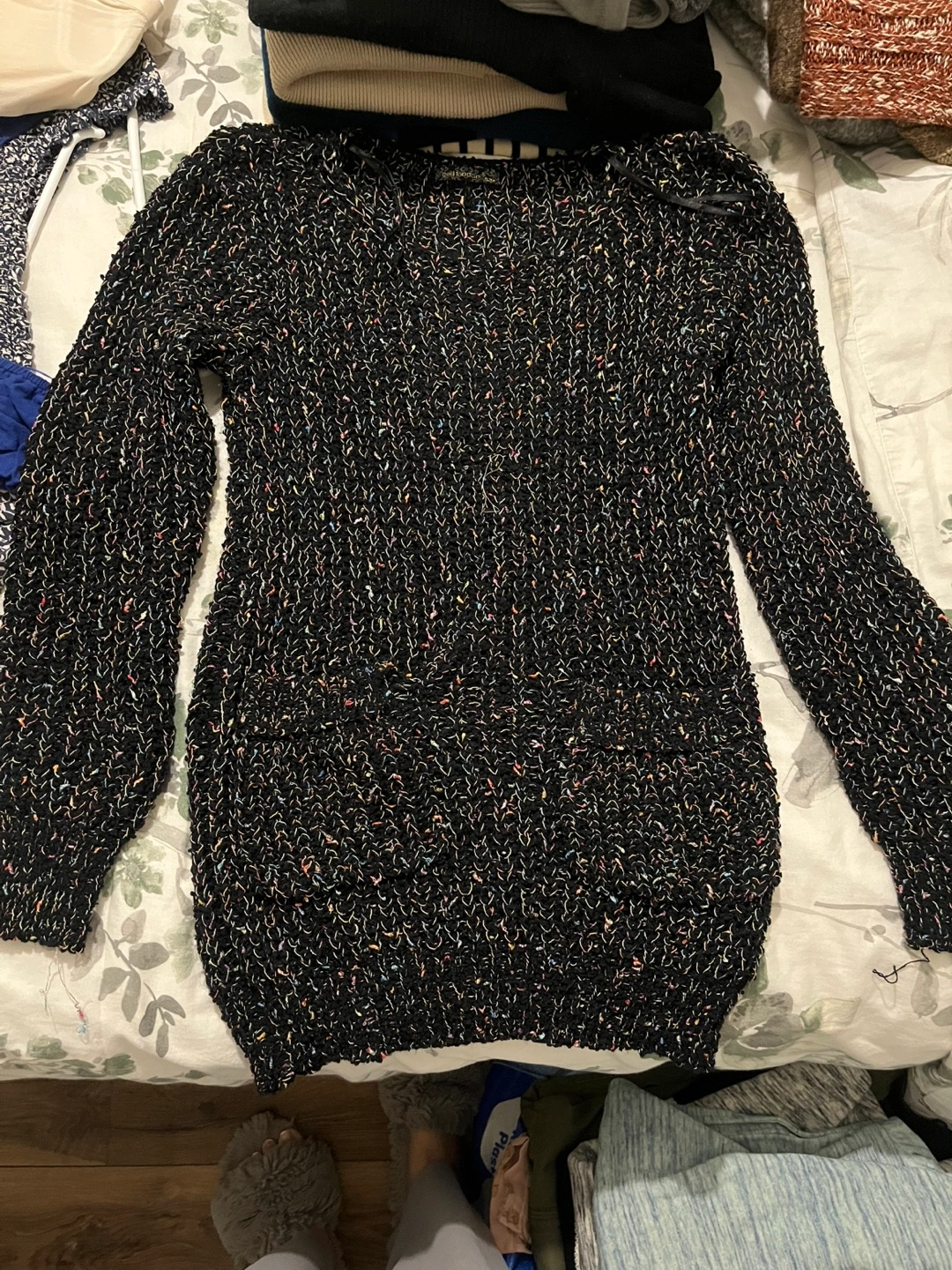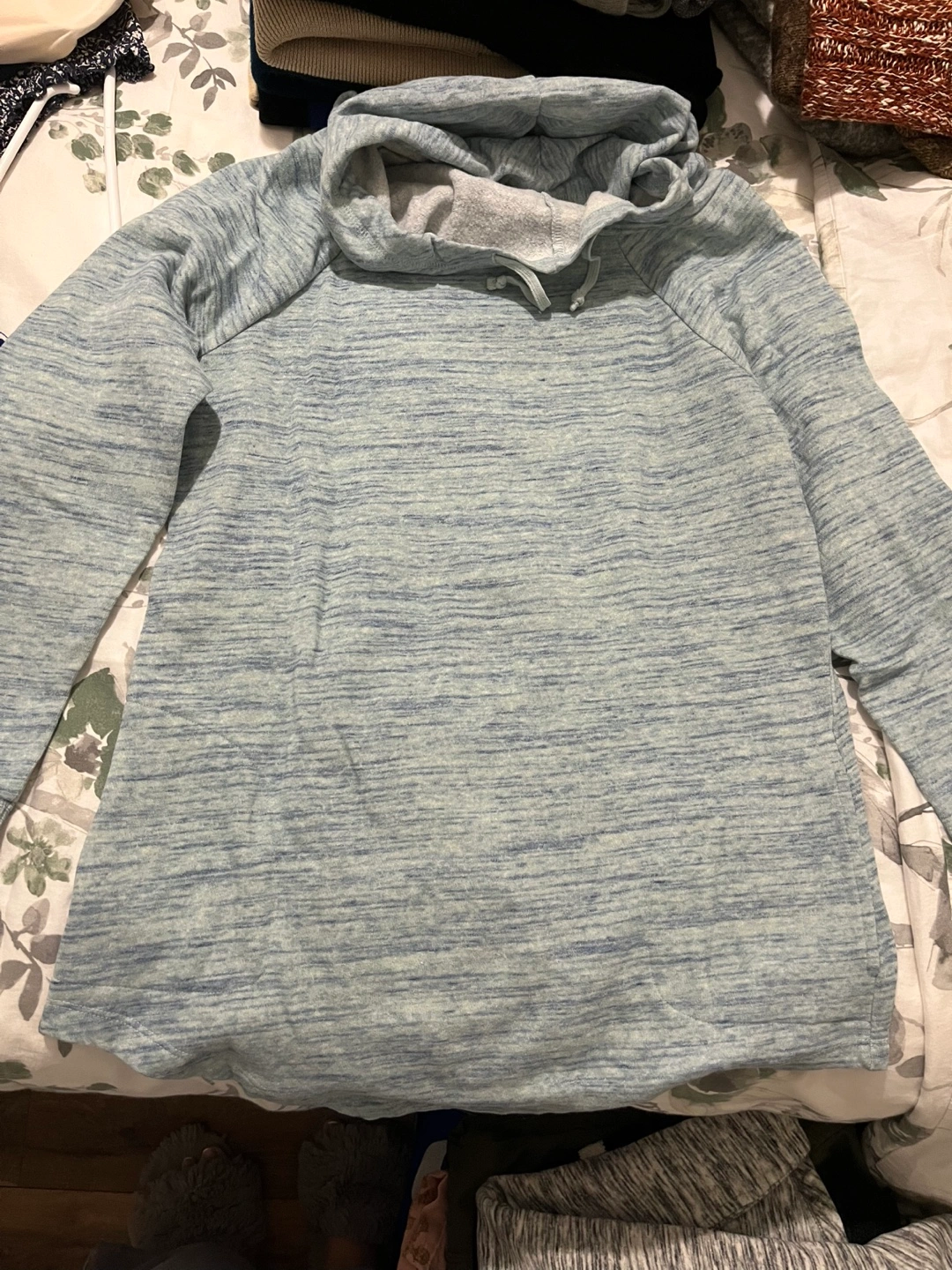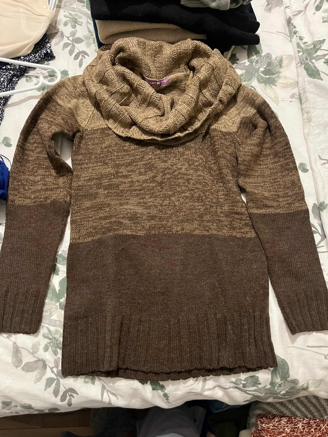 Five women's sweaters. Grey and black marl cardigan, cowl neck sweatshirt, light blue cowl neck sweatshirt, patterned fair isle sweater, and black and white striped V-neck sweater. Bundle for only $40