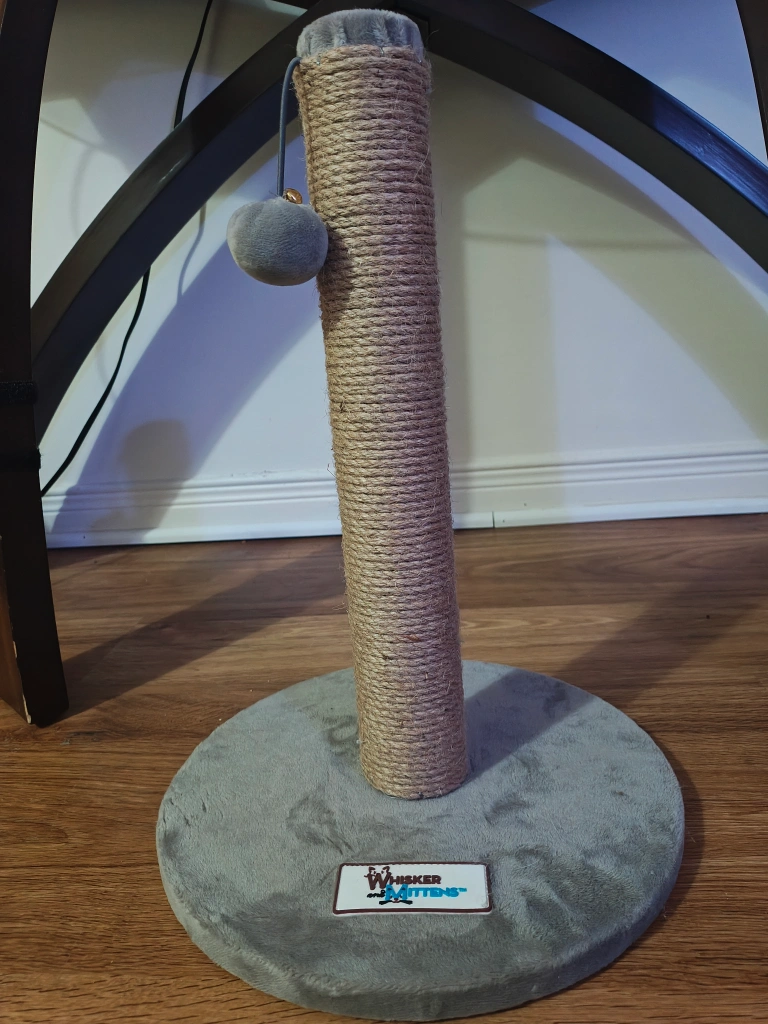 Grey and beige scratching post. Sturdy base. Small hanging toy. Height ≈ 43 cm Diameter ≈ 29cm