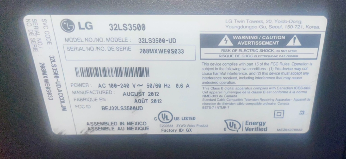 32-inch LG LCD HDTV. Model number 32LS3500-UD. Manufactured August 2012. Includes remote. Great condition. Not a Smart TV.