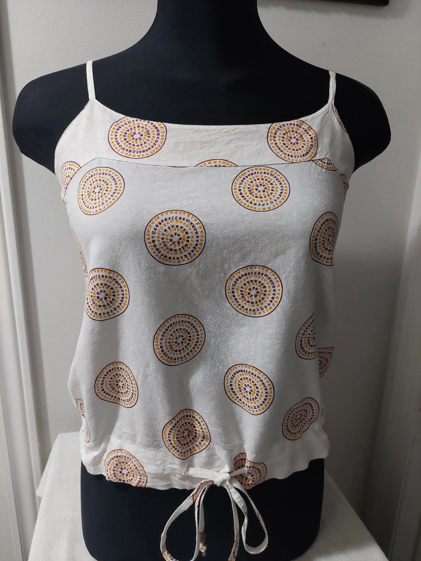 White tank top. Features a drawstring and elastic waist with interested patterned design. 100% viscose. Size Large Adjustable shoulder straps. Please browse at my other pieces for a discount on multiple orders. Thank you for your time.