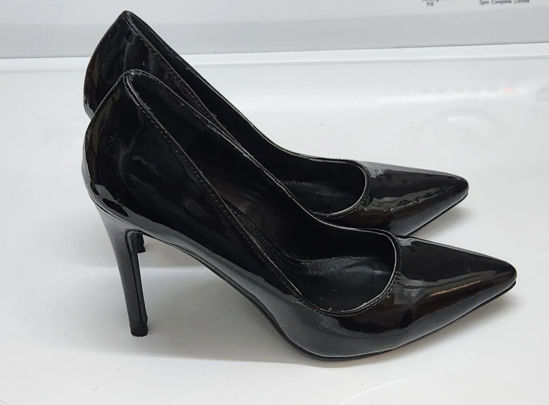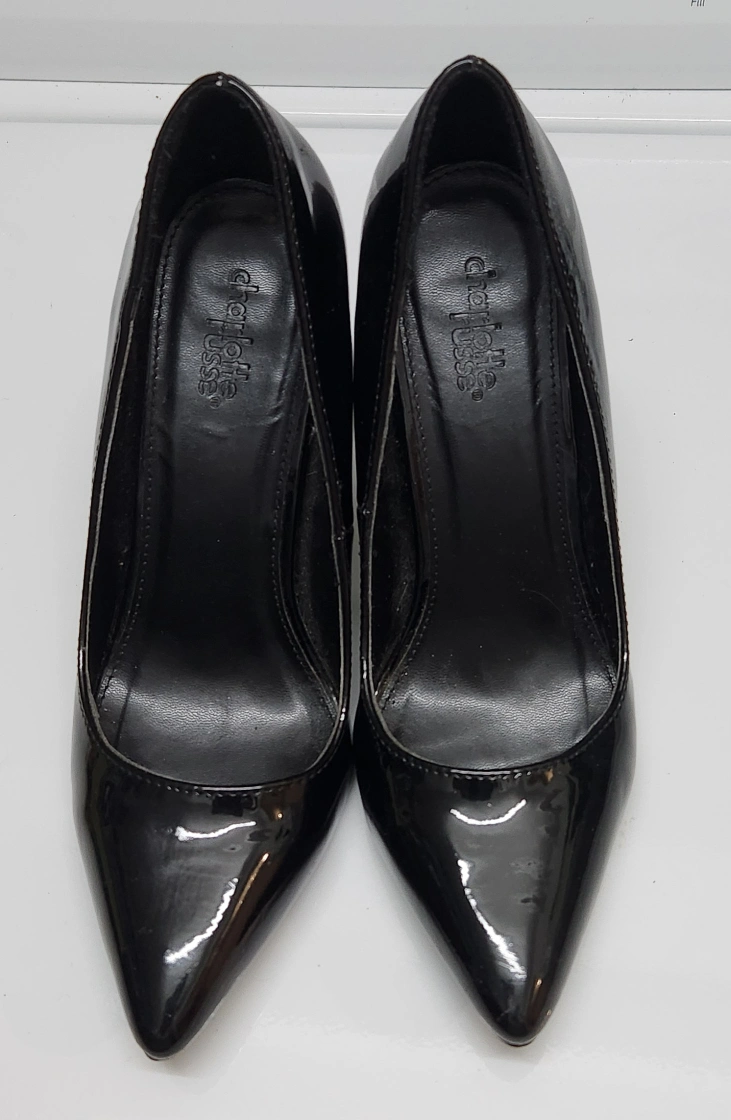 Elegant black patent leather pointed-toe heels. Stiletto heels. Great for special occasions.