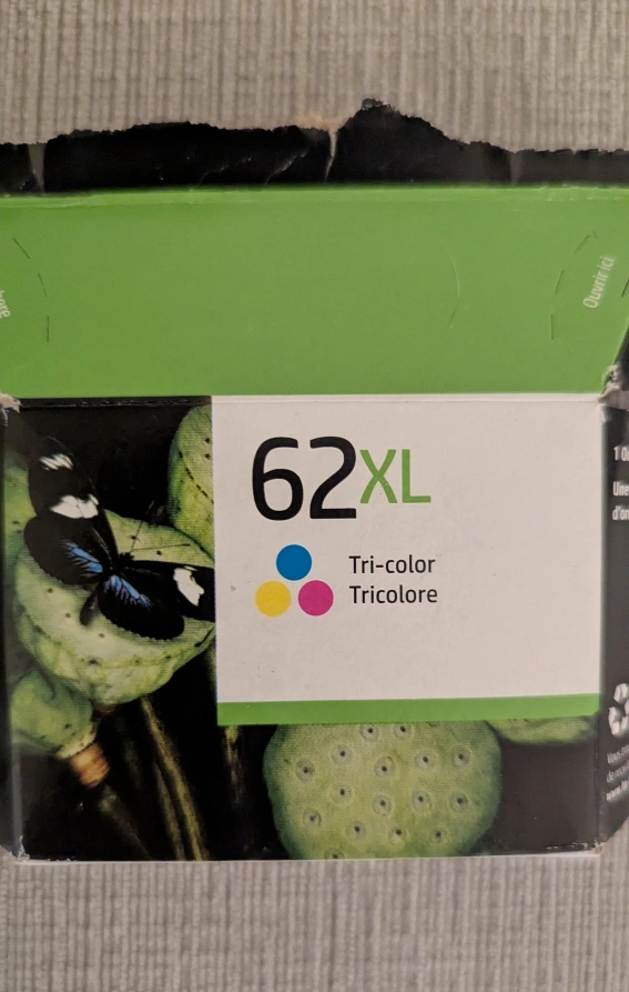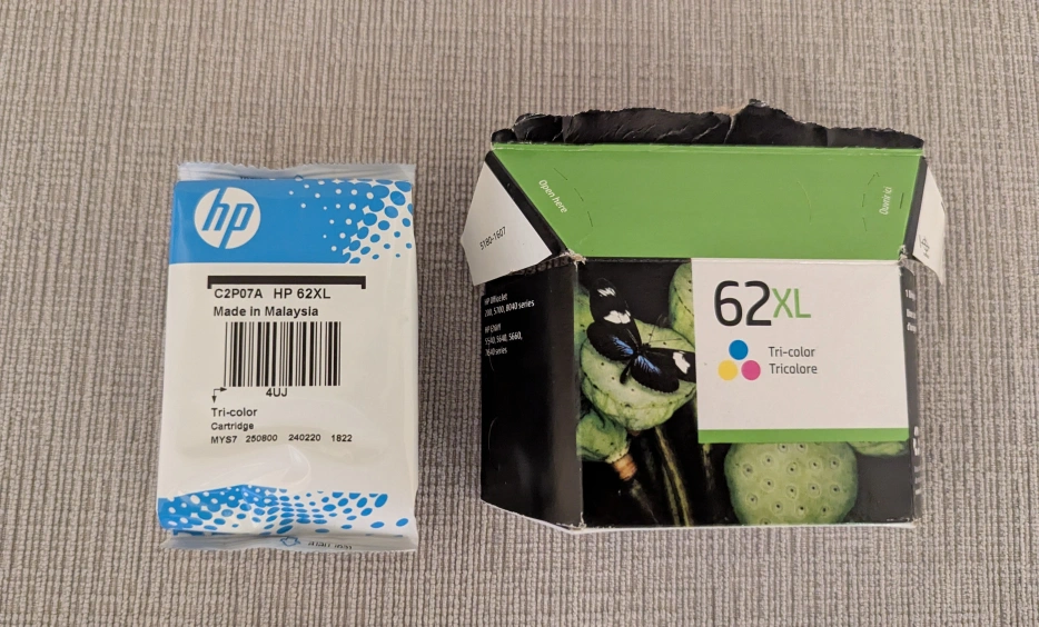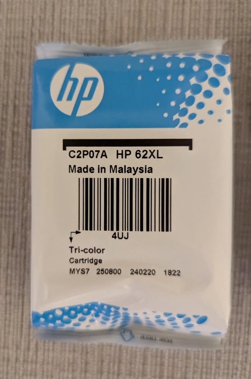 New HP 62XL tri-color ink cartridge. Model number C2P07A. Made in Malaysia.