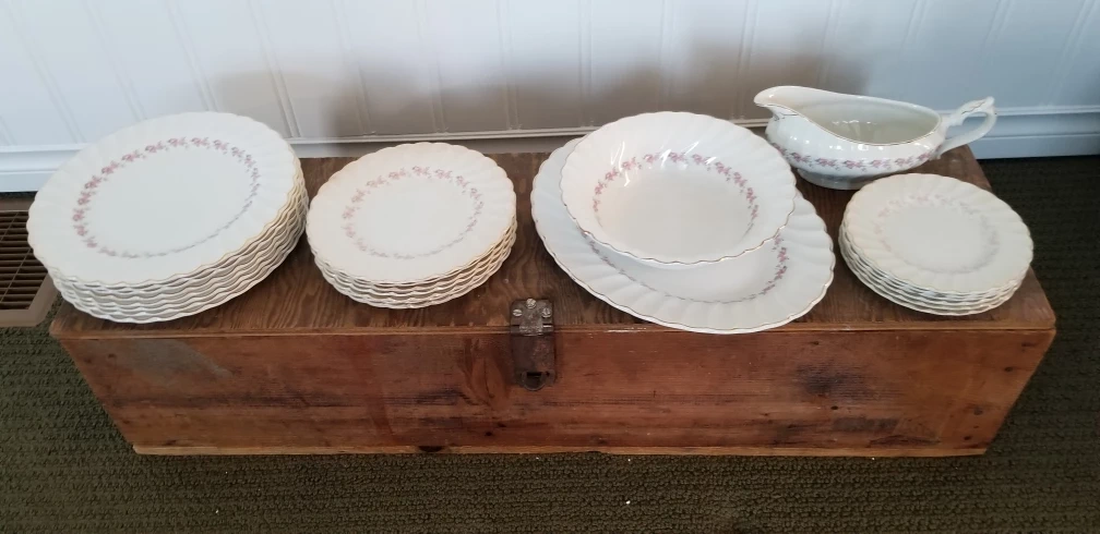 Ironstone Staffordshire Serving dish Set made in England , a beautiful set of pink rose patterned dishes that consist of 8 dinner plates, 8 bread & butter plates, 1 oval serving platter, 1 serving bowl, 1gravy boat, and 8 desert plates. No chips .