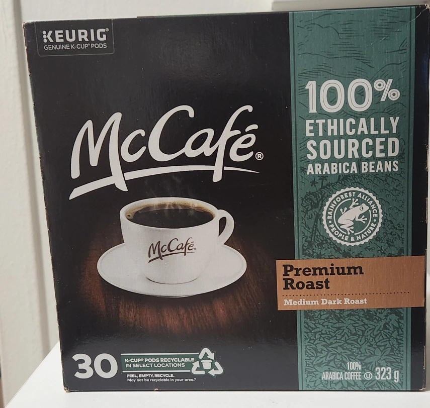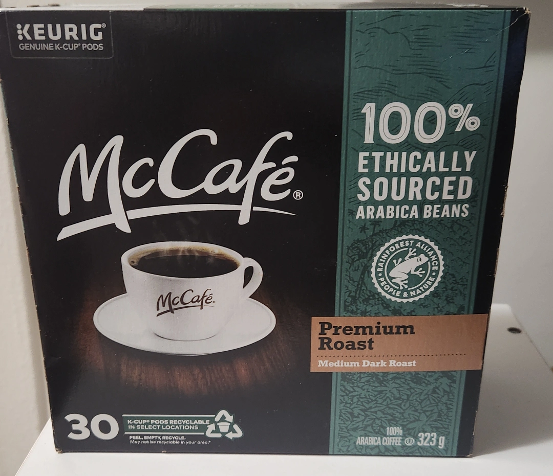 30 single-serve K-Cup pods. Premium roast, medium dark roast. 100% ethically sourced Arabica beans. Recyclable K-Cup pods.
