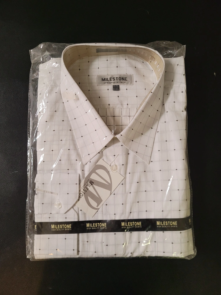 New with tags, men's long sleeve dress shirt. White with black grid pattern. Designed in Italy. High-quality shirt.