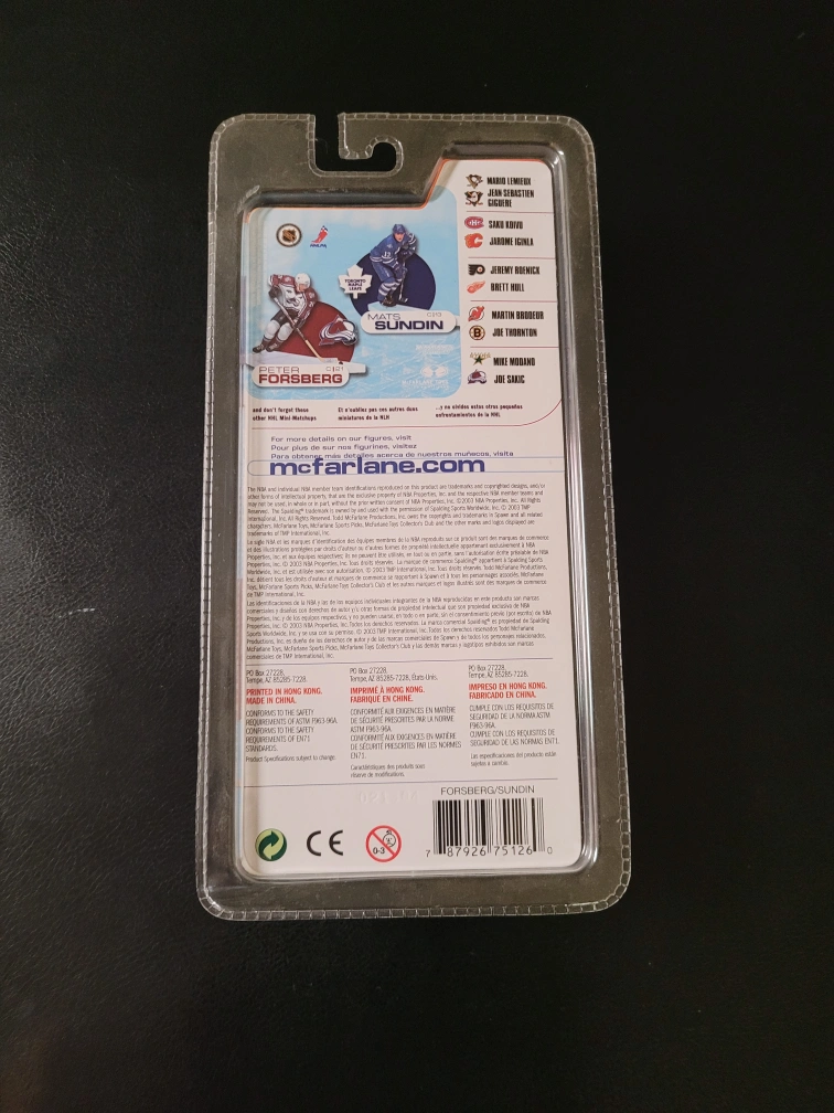 Two collectible hockey figures. New in package. Includes Mats Sundin and Peter Forsberg. Small parts, not for children under 3 years.