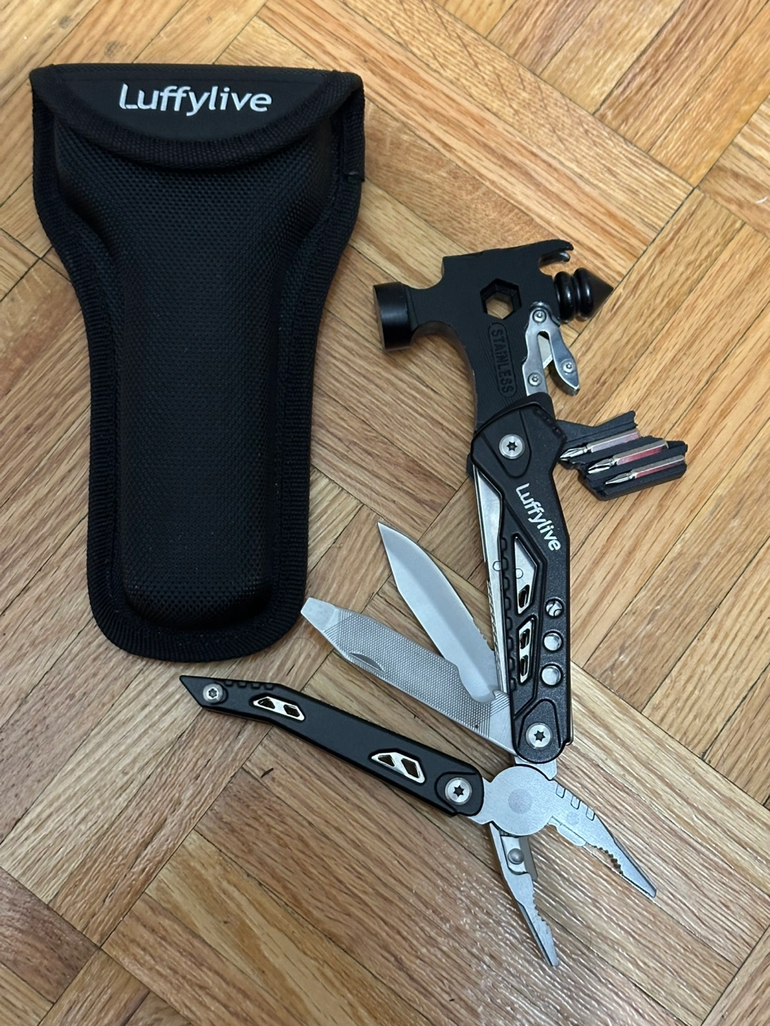 Compact multi-tool, includes hammer, pliers, screwdriver, knife, and more. Features a convenient nylon sheath for storage and portability. Stainless steel components.